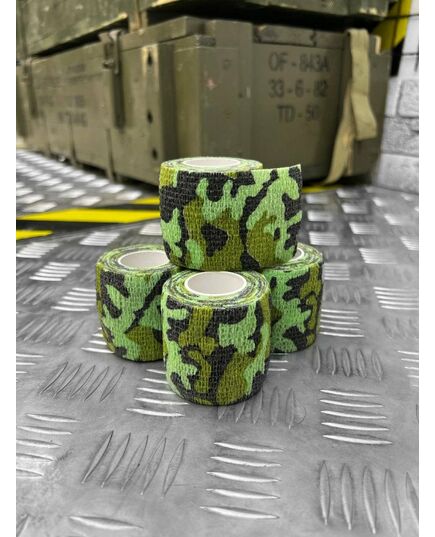 Також камуфляжна стрічка застосовна для польової медицини: в екстрених випадках її можна використовувати як стягуючий компресійний еластичний бинт (еластичний бандаж). . Вона чудово тягнеться і має здатність "липнути" до предметів і самої себе. Для "приклеювання" достатньо лише трохи розтягнути шматок тканини, що тягнеться, і обернути його внахлест навколо потрібної речі. Завдяки безлічі маленьких резиночек і високої еластичності матеріалу, камуфляжна стрічка чудово розтягується: одного рулону вистачить, щоб покрити площу, що в 90 разів перевищує його товщину! . Камуфляжна стрічка багаторазова - при необхідності її можна зняти і звернути назад у рулон, а потім знову використовувати, маскуючи потрібні речі.