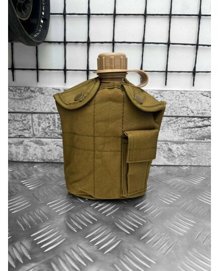 Пластикова фляга американського (США) типу в нейлоновому чохлі з невеликим зовнішнім карманом (закривається на липучку) ). Фляга виготовлена ​​із харчового полимеру, завдяки чому вона легка та безпечна для здоров'я. Кришка надійно прикріплена до фляги так, що вона не може бути втрачена. Термочохол добре підтримує температуру рідини у флязі. Чохол оснащений невеликим карманом збоку.