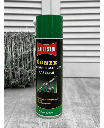Олія-спрей збройна Ballistol Gunex-2000 – збройова олія, що забезпечує антикорозійний захист. Оптимізовано для догляду за зброєю, але застосовується в багатьох областях. Відповідає суворим вимогам військових та власників зброї. Видаляє пороховий нагар та залишки томпаку, розчиняє смолисті відкладення. змащує та захищає механізми від іржі. Має відмінні проникаючі і змащувальні властивості. Ідеально підходить для догляду за мисливськими та спортивними карабінами, пістолетами, револьверами та сигнально-шумовими зброєю. . Проникає в область між металом та вологою, потрапляє у найтонші тріщини, очищає, зберігає поверхні гладкими, не липне та не реагує з іншими речовинами. Ballistol Gunex не містить силікону, хлорованих гідрокарбонатів та руйнівних озон речовин CFC.
