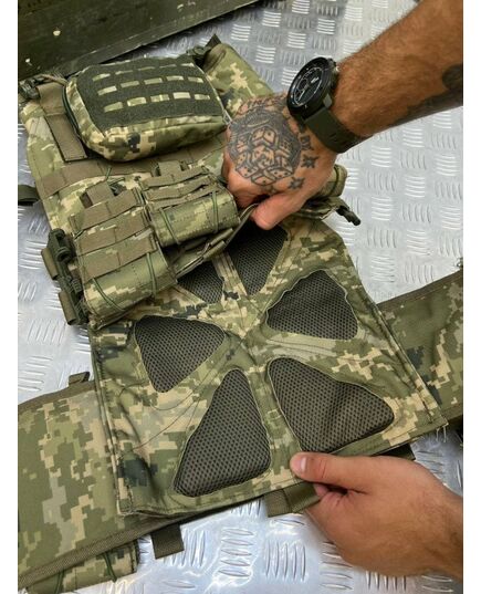 Виготовлений із міцної водонепроникної тканини нейлон Cordura і обладнаний модульною системою знімних підсумків.Вільно регулюється за висотою та об'ємом. Верх – регулюється ременями, низ – якісною, міцно прошитою липучкою класу "А". Також є швидке скидання бронежилета від спорядження для надання допомоги бійцю. Виготовлена плитоноска із щільної кордури 1000D, яка стійка від розривів та стирання. Зсередини є вставки з 3D сітки, завдання яких забезпечити необхідну терморегуляцію тіла при тривалому носінні та інтенсивному русі.