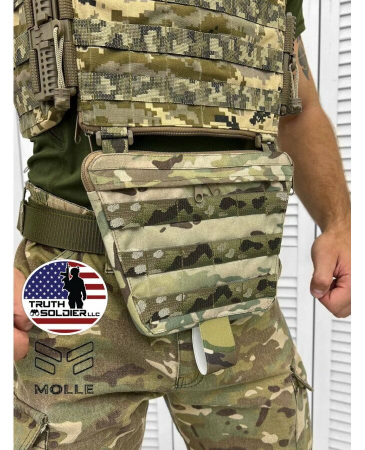 Напашник TRUTH SOLIDER LLC виготовлений з Cordura 500d у кольорі MultiCam - міцного матеріалу, стійкого до стирання та високих навантажень. Кріпиться за допомогою стропи моллі. Знизу напашника гумка для турнікету в комплекті балістичний протиуламковий пакет, що відповідає вимогам ВСТ 01.301.003-2020(2) STANAG 2920, V 50 – 416,7 м/с. згідно з протоколом випробувань науково-випробувального відділу Національного університету оборони України ім. Івана Черняховського. N87/2023 від 23.03.2023р
