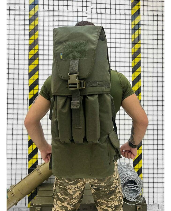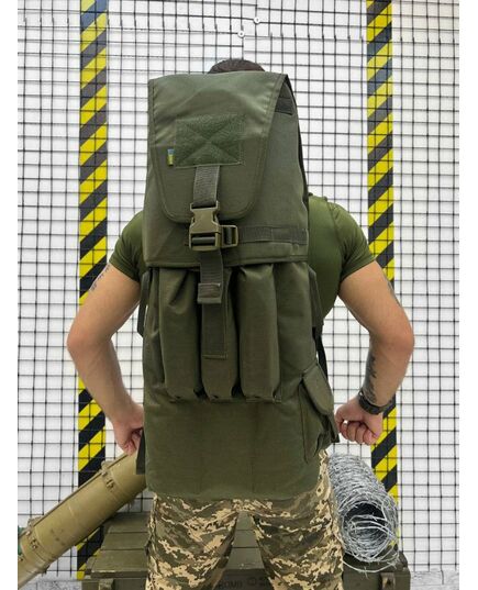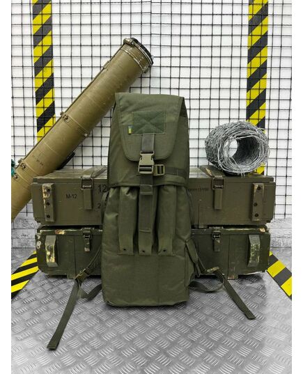 < Рюкзак щільно закривається трьома клапанами (два з боків і один зверху) за принципом конверта, фіксуючись при цьому фастексами. Обладнаний трьома розділеними відсіками для пострілів з РПГ-7 і трьома отворами для порохових зарядів. З правого боку має додаткову кишеню на велкро. М'які плечові лямки та стропи для фіксації рівномірно розподіляють вагу та зменшують навантаження на спину. Спинка рюкзака посилена двошаровим наповнювачем Поліфом 20 мм.