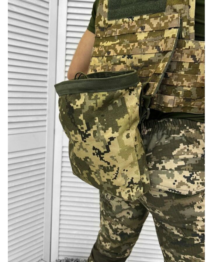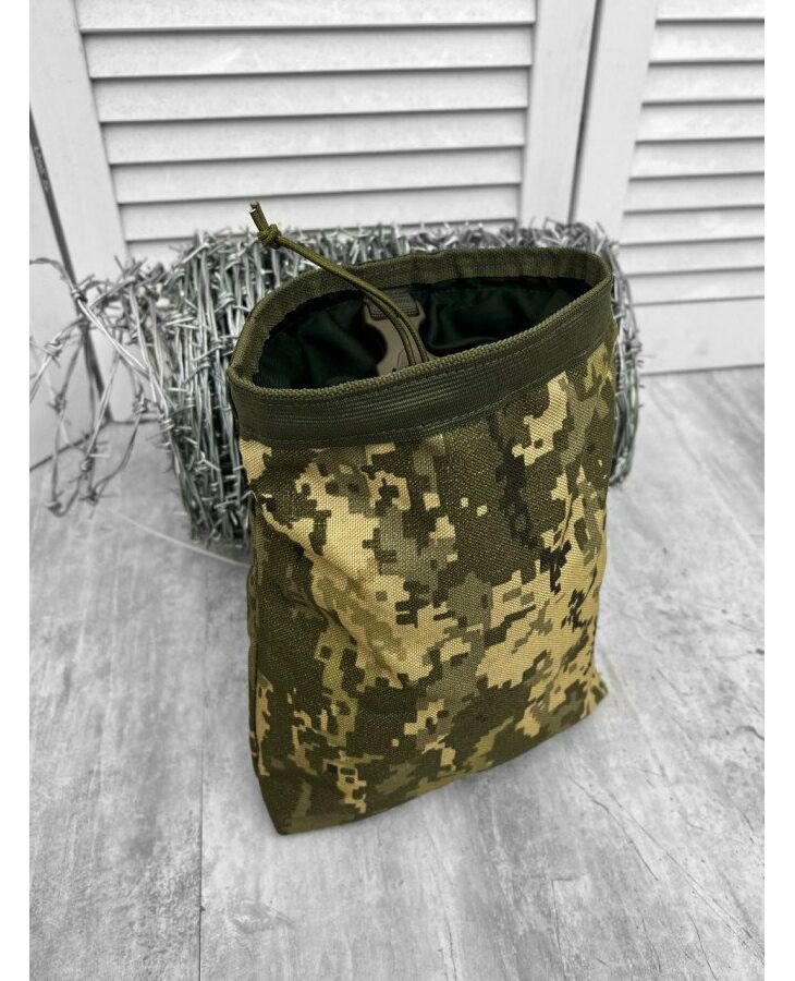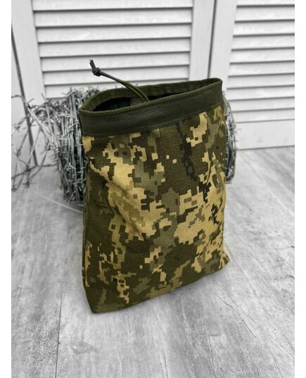 Сумка виготовлена з товстого та надійного матеріалу, затягується та затискається на пластиковий фіксатор, добре складається, кріпиться до систем Molle за допомогою стрічок PALS.