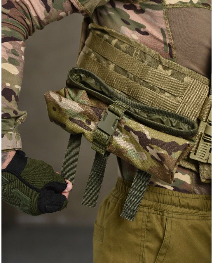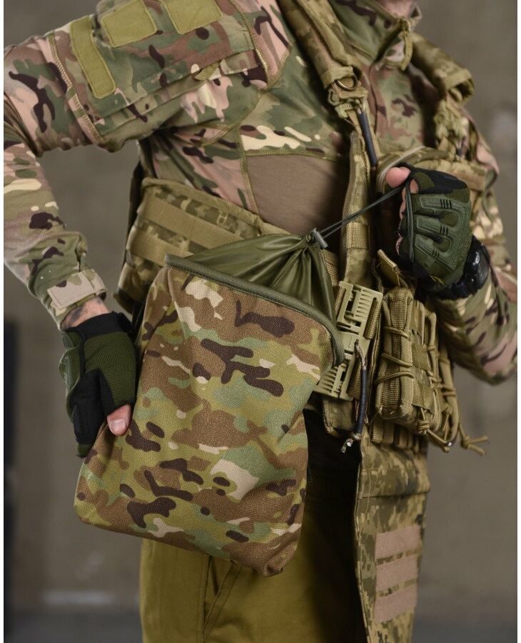 Сумка виготовлена з товстого та надійного матеріалу, затягується та затискається на пластиковий фіксатор, добре складається, кріпиться до систем Molle за допомогою стрічок PALS.