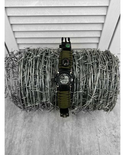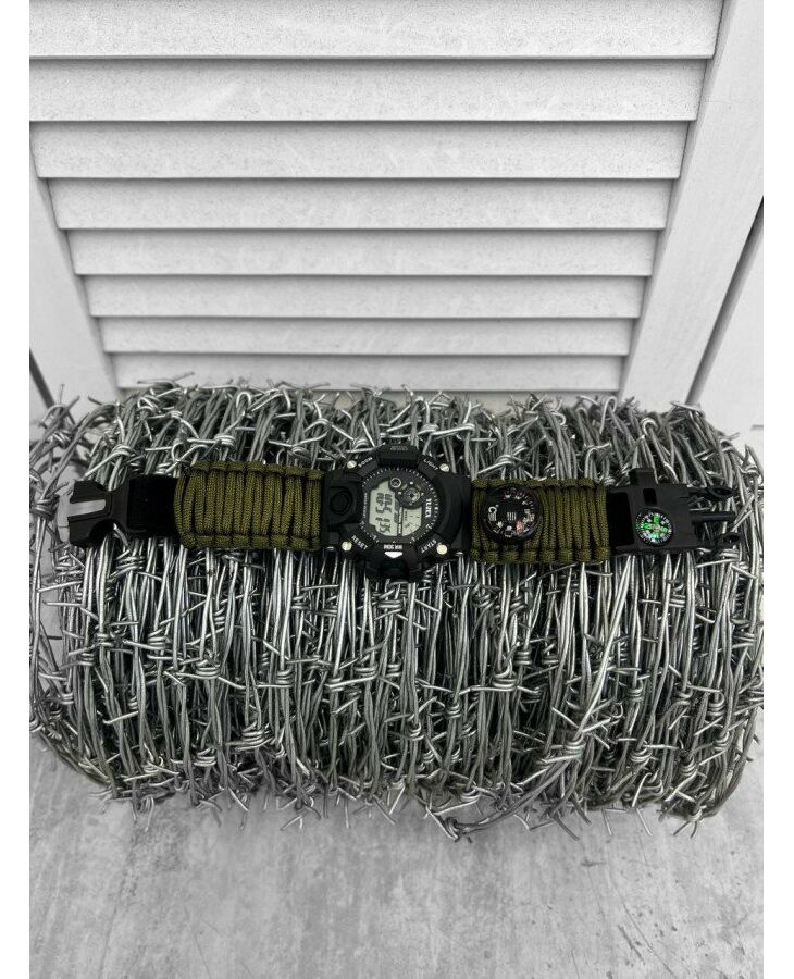 Годинник для виживання – гаджет 7 в 1: це компас, кремінь, свисток, ніж-скребок, градусник та запас міцної мотузки для використання в екстремальних умовах. Туристу, мисливцю, рибалці, армійцю вкрай важливо орієнтуватися в часі та просторі. А ще користуватися функціональними речами. Фішка пристрою - в ремінці: при необхідності його можна розібрати і використовувати як мотузку. В екстрених випадках вона, наприклад, зупинить кровотечу, виступить матеріалом для створення пастки, зв'яже деталі намету або кемпінгу, утримає комплекти армійського спорядження. Крім того, годинник з браслетом з паракорду має: ;