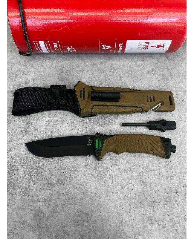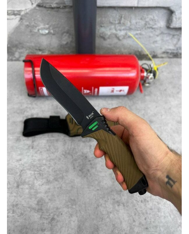 Характеристики: Довжина ножа: 27 см. Матеріал рукояті: ударостійкий пластик і гума Вес ножа: 185 г Вес ножа в піхвах: 300 г Довжина клинка: 13 см Товщина клинка: 3,5 мм Кут заточування: 35 440С