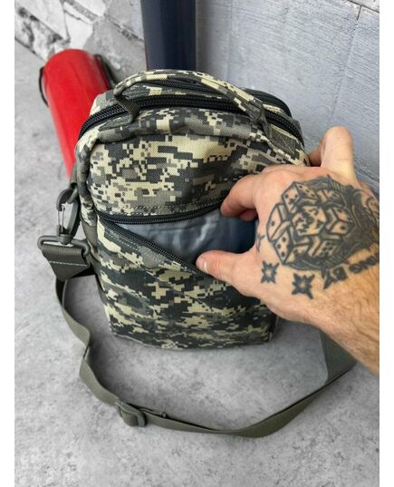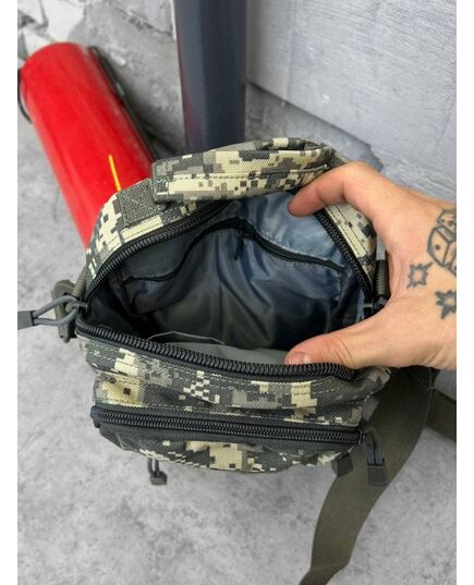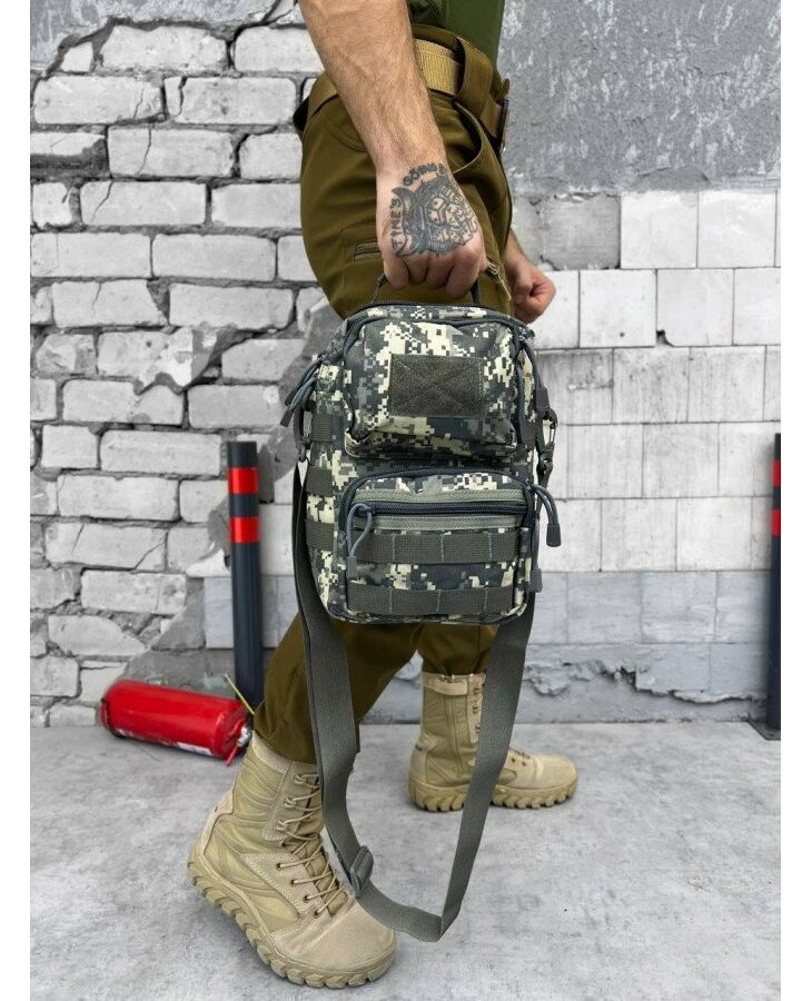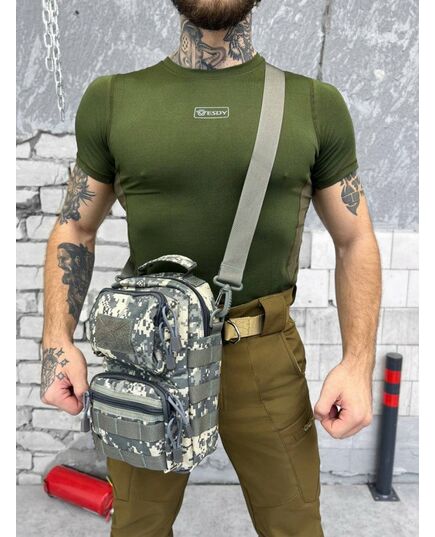 Тактична сумка на одній лямці виготовлена із міцного матеріалу, який не промокає та стійкий до знесення. Колір сумки можна вибрати під колір екіпіровки. Об'ємки становить 0,84 л. Сумка підійде як для правші, так і для шульги. Довжина лямки регулюється. Сумка поділена на основне відділення та кілька маленьких відділень. Всі вони застібаються на блискавку. На лицьовій стороні сумки розташовані нейлонові стропи, на які можна прикріпити спорядження. На аксесуар можна кріпити шеврони. Характеристики: Матеріал: поліестер, ПВХ. Розмір: 17х11х4, 5 см.