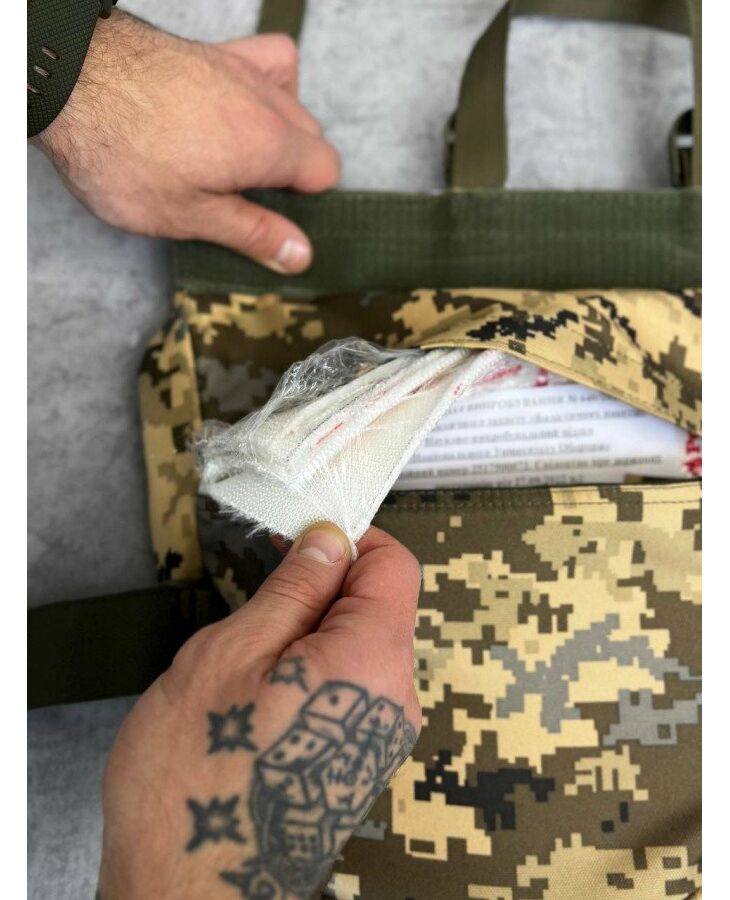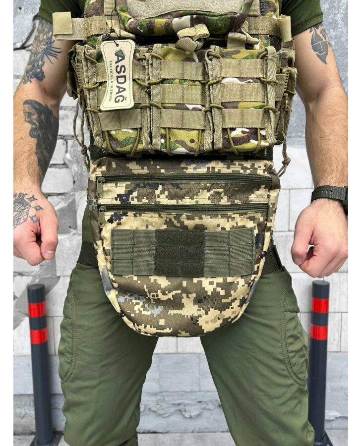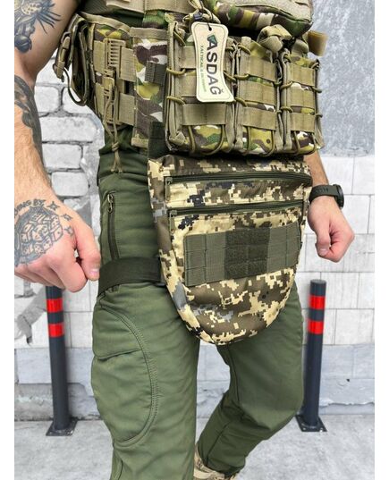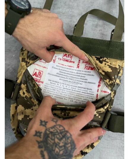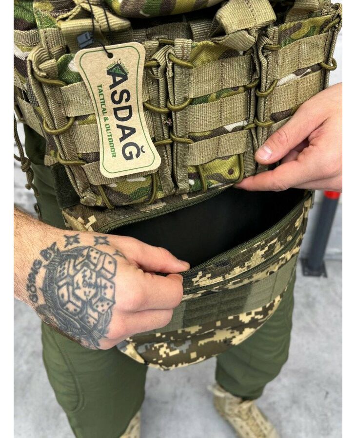 Сумка оснащена системою MOLLE, що складається з ряду петель, ременів та кріплень, розташованих на поверхнях сумки. Це дозволяє прикріплювати додаткове обладнання, таке як кобури, патронташі, підсумки, кишені та інше, забезпечуючи налаштування та персоналізацію сумки відповідно до потреб користувача.