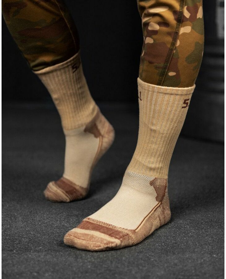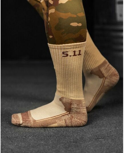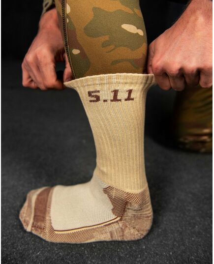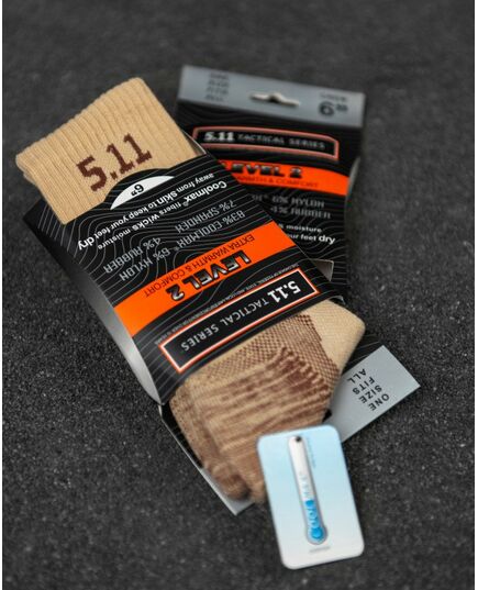 Термоноски 5.11 Tactical 59047 були розроблені як елемент екіпірування для тривалих переходів у зимовий час (турпохід, полювання, альпінізм), проте користуються широкою популярністю і в повсякденному житті. Для їх виготовлення використовується сумішова нитка, яка включає бавовну, волокна нейлону, спандекс і поліестер. Цей матеріал відводить вологу зі шкіри ефективніше, ніж чиста бавовна – а значить, ноги залишаються сухими і не піддаються таким неприємностям як переохолодження та потертості. Також він характеризується еластичністю, за рахунок чого шкарпетки не тільки надійно триматися на нозі, але й компресійно впливають, знижуючи втому. Мисок і п'ята шкарпеток посилені додатковою ниткою та стійкі до стирання.