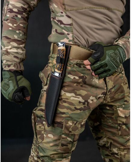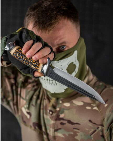 Наверши розташований отвір для темляка. У комплект входять посилені кордурові піхви з петлею для носіння на поясі. - довжина ножа - 30,5 см. - довжина колодки - 13 см. - довжина леза - 17 ,5 см.