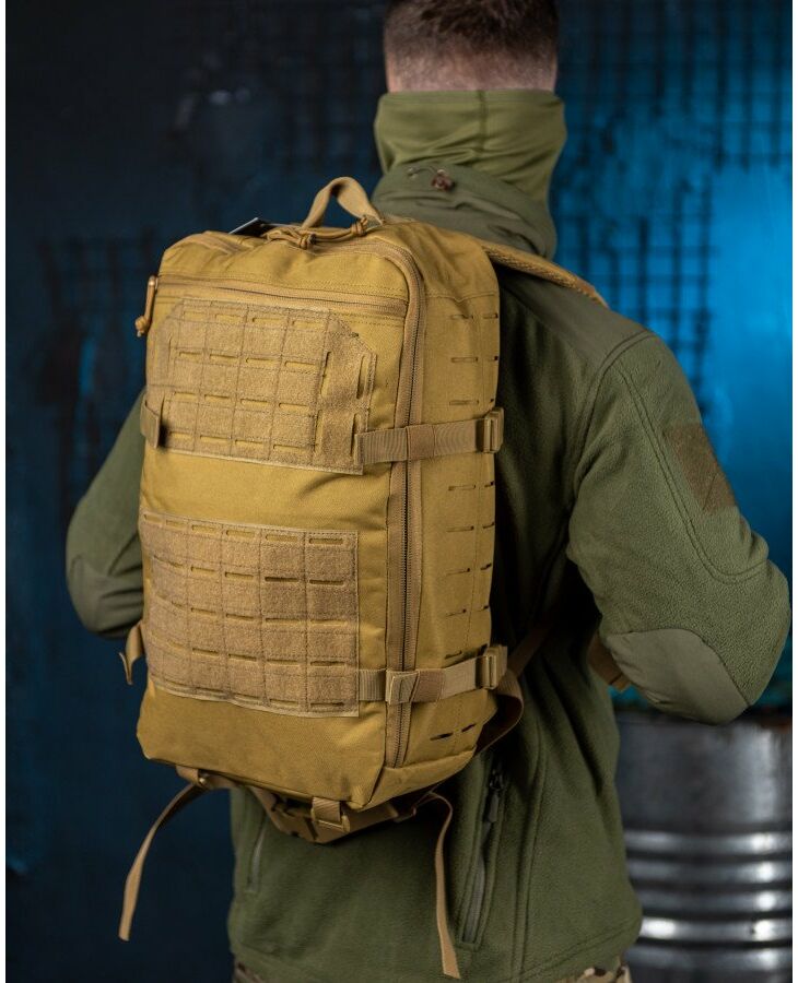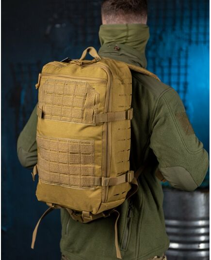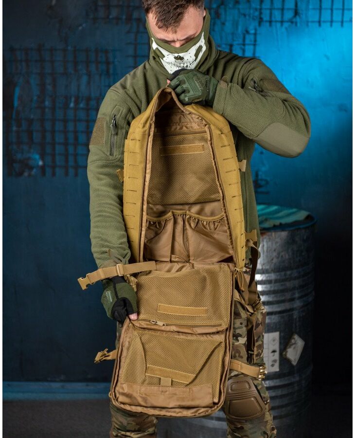 Практичний та місткий тактичний штурмовий триденний рюкзак, що має два основні відділення об'ємом 35 л. Система строп MOLLE дозволяє закріпити додаткові результати на рюкзаку. Нагрудна фіксація та регульований поясний ремінь забезпечують рівномірне навантаження на плечі та поперекову зону, а також надійну фіксацію під час бігу. Поздовжні та поперечні лямки дозволяють стягнути максимально щільно рюкзак при неповному заповненні.