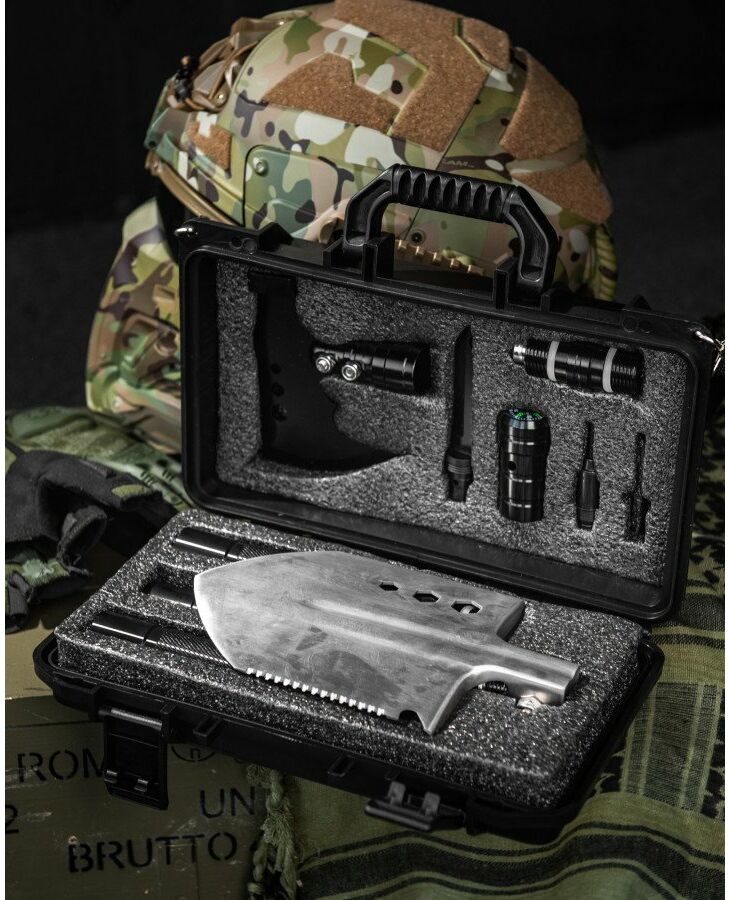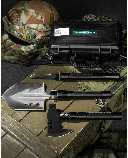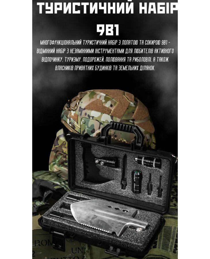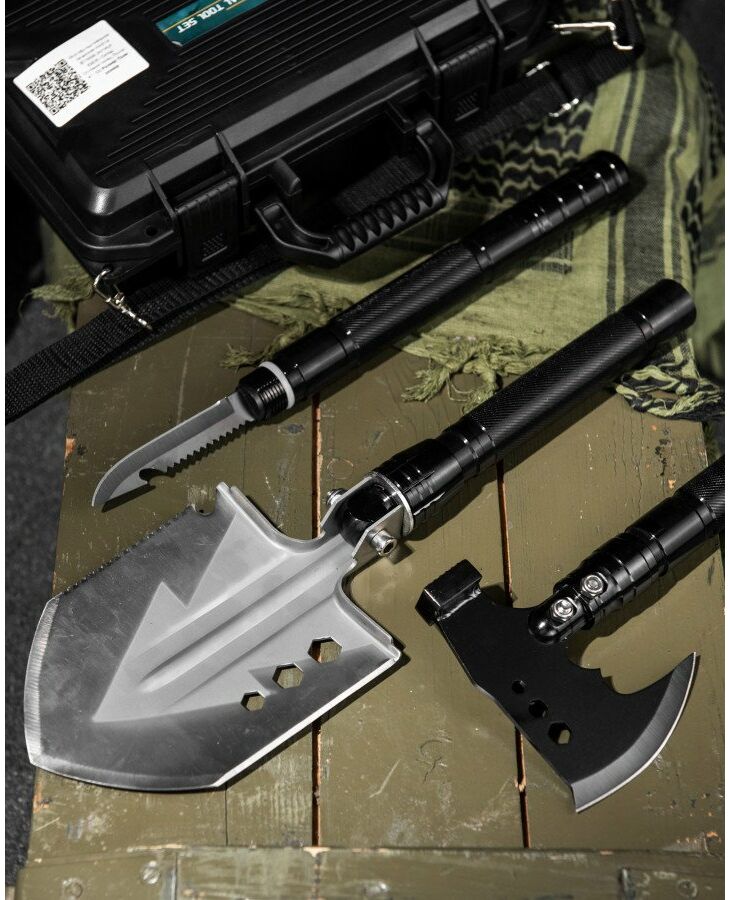 Многофункціональний туристичний набір з лопатою та сокирою 9в1 - відмінний набір з незамінними інструментами для любителів активного відпочинку, туризму, подорожей, полювання та риболовлі, а також власників приватних будинків та земельних ділянок. Збірна туристична лопата, портативна сокира, будуть завжди напоготові в будь-якій дорожній та побутовій ситуації. Набір зібраний в компактний кейс з лямкою, для зручності перенесення. Лопата складана