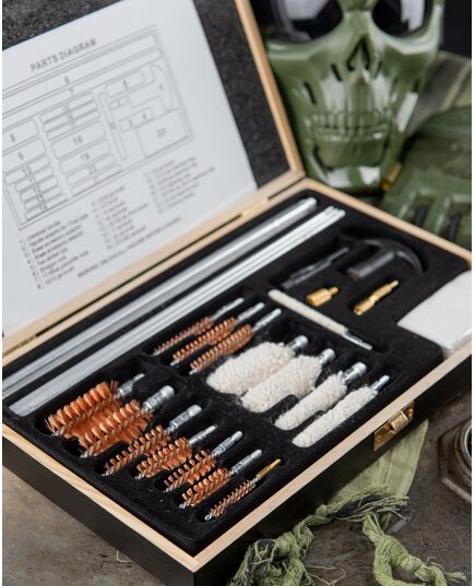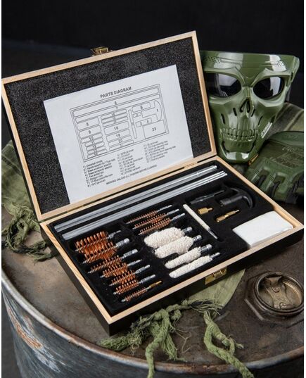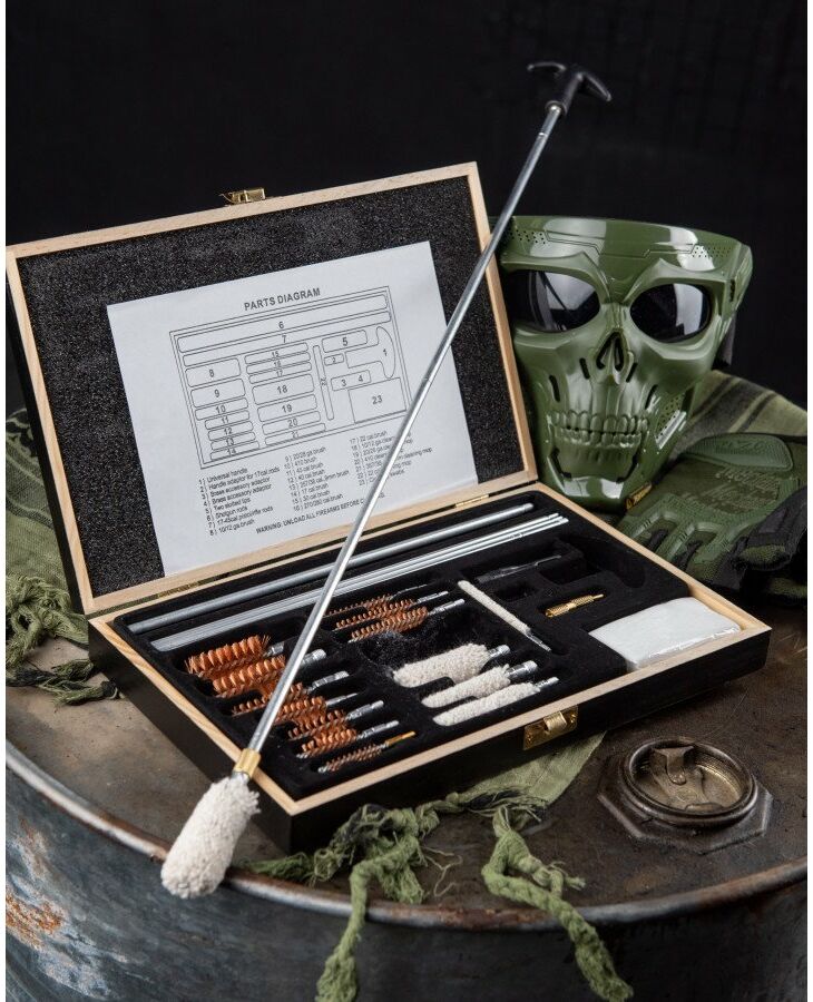 Набір по догляду за зброєю від німецького бренду MFH (Max Fuchs). Підходить для пістолетів, автоматів, карабінів, рушниць. Максимальна довжина шомпола 70 см + довжина насадки/щітки. У комплекті є дерев'яна коробка для зберігання.