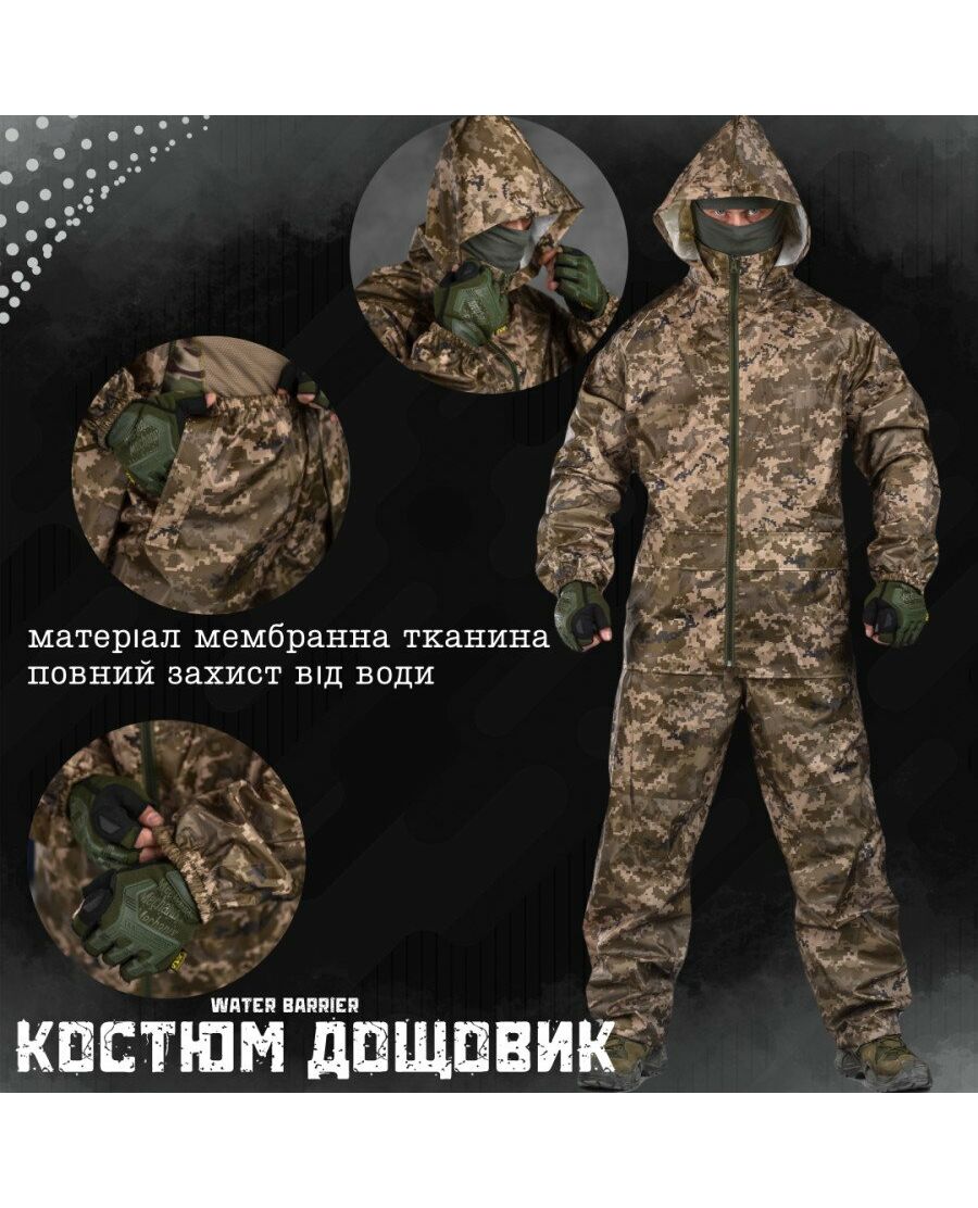 Тактичний костюм-дождевик Water Barrier Pixel створений для максимальної захисту від дощу, вітру та бруду. Мембранна тканина повністю блокує вологу, залишаючись при цьому “дихаючою” — комфорт навіть при тривалому носінні.