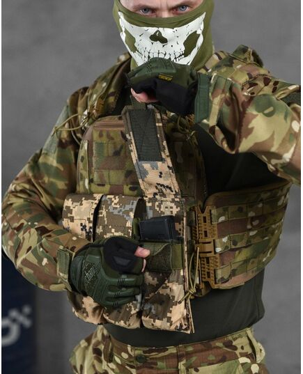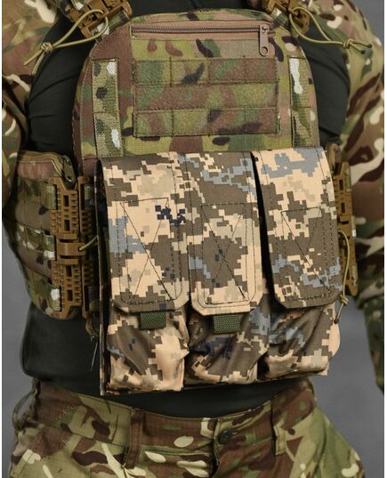 Підсумок UMA під три магазини по одному в кишені - зручний і надійний підсумок, який забезпечує надійну фіксацію на грудях відразу трьох магазинів кожен в окремій кишені. На такий підсумок лягати зручніше, ніж на подвійний. Тому цей підсумк популярний серед бійців підрозділів спеціального призначення і військових, які активно пересуваються по сірій зоні. Знизу в кожному з трьох відділень підсумка встановлений люверс для випуску з відсіку вологи, пилу та бруду. Тканина, з якої виготовлено виріб – Cordura 1000 den – не горить, не плавиться, надійна та довговічна. Перевагою такого підсумку на 3 магазини, як і всіх виробів компанії UMA є маскування системи MOLLE, яка не виділяє і повністю маскує бійця.