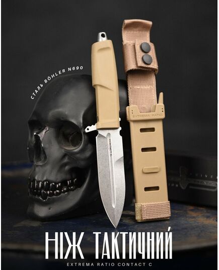 Компактна версія тактичного ножа Extrema Ratio Contact C має клинок виконаний із сталі Böhler N690. Модель має універсальні експлуатаційні характеристики та стійкість до екстремальних навантажень. Рукоятка тактичного ножа Contact виготовлена з термопластичного матеріалу Forprene. Вага 273 р. Extrema Ratio Contact оснащений зносостійкими нейлоновими піхвами, сумісними з M.O.L.L.E. системами.