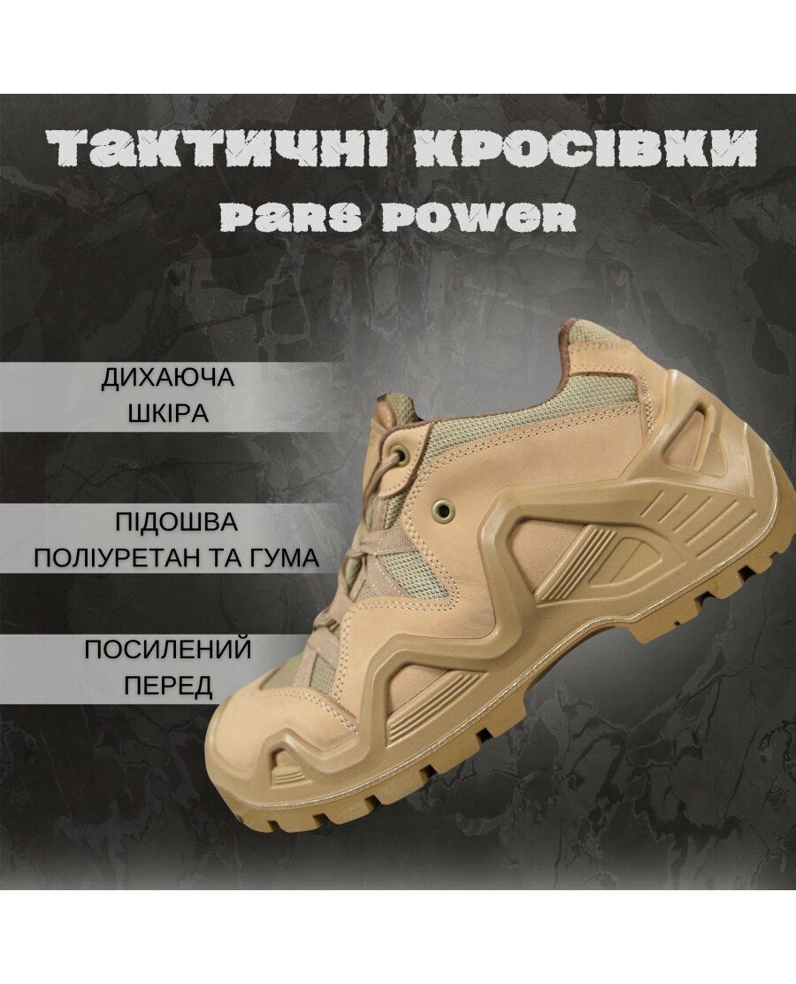 Тактичні кросівки PARS POWER -преміальна дихаюча шкіра -підошва бензо-маслостійка -має мембранну технологію. -висока повітропроникність (захист від поту) -зносостійкість Технологія підошви з поліуретану та гуми подвійної щільності М'яка та легка проміжна підошва, гумова підошва з високим опором ковзанню. Завдяки спеціально розробленій базовій конструкції він забезпечує відмінну мобільність та стійкість користувачеві під час підйому по місцевості або подолання перешкод. Додаткові можливості: анатомічна форма, що миється, вбирає вологу і швидко висихає....