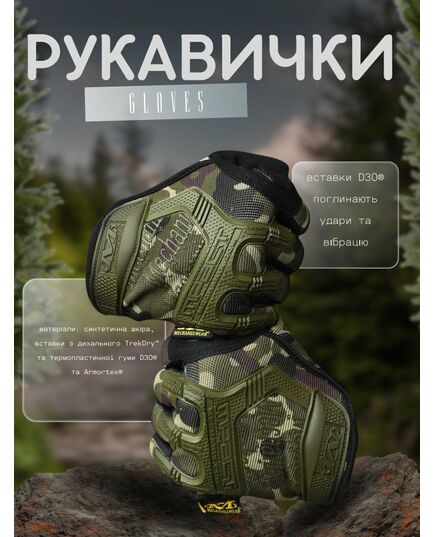 Модель тактичних безпалих рукавичок M-Pact Fingerless виготовлена ​​з високоміцної синтетичної шкіри та вставок з еластичного та дихаючого матеріалу TrekDry™. Додатково долоня безпалих рукавичок посилена вставками з матеріалів D3O® та Armortex®. Вставки D3O® призначені для розсіювання енергії ударів та вібрацій, тим самим знижує втому рук. Вони виготовлені з термопластичної гуми (TPR), сертифікованої за стандартом EN 13594. Бренд Mechanix Wear® займається розробкою та виготовленням захисних рукавичок та інших товарів у даній сфері. Військовослужбовці всього світу та кваліфіковані фахівці різних сфер діяльності віддають перевагу товарам бренду завдяки анатомічному дизайну виробів, передовим технологіям виробництва матеріалів та суворим стандартам тестування.