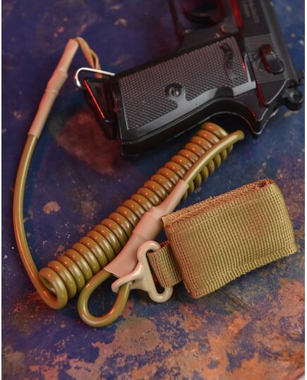 З іншого боку є металевий карабін, за його допомогою шнур легко прикріпити до пістолета у вуха на рукояті або, у разі необхідності, пристебнути зв'язку ключів, ліхтарик, чим і і т.д. Загальна довжина з підвісом може спокою: приблизно 48 см. Довжина спіралі у стані спокою – 17-18 см. Зовнішній діаметр спіралі – 14 мм, діаметр шнура у перерізі – 3,5 мм.