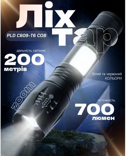 Кишеньковий ліхтарик PLD C609-T6 COB - надійне і компактне джерело світла . Поєднує в собі високу потужність світла, дальність світіння та енергоефективність. Світлодіоди T6 і COB забезпечують яскраве і рівномірне світло. Переваги: