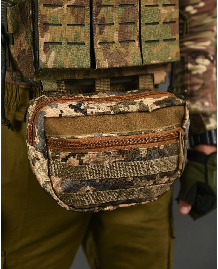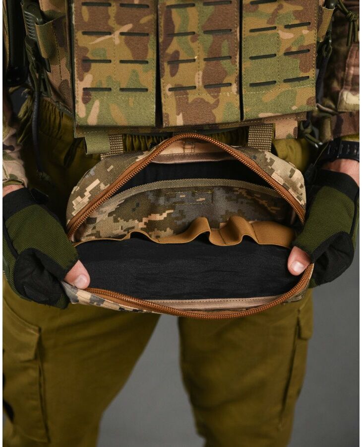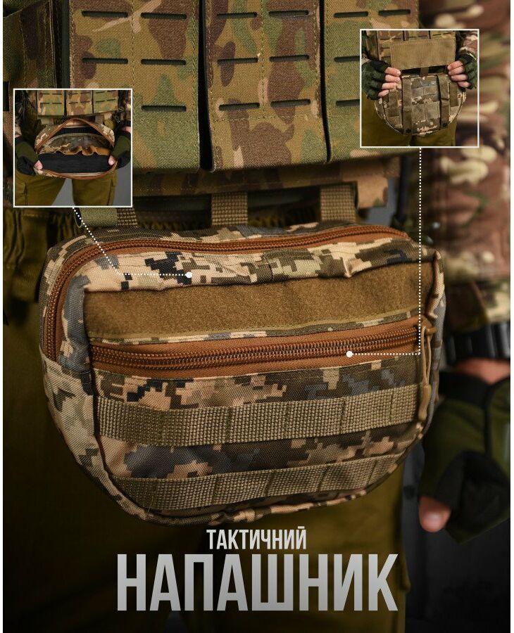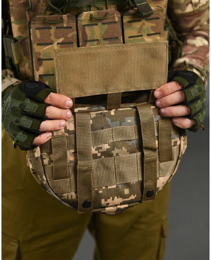 Практична та функціональна сумка-напашник чудово доповнить індивідуальний комплект спорядження будь-якого професійного військового та збільшить площу захисту. під захисним клапаном, збільшуючи таким чином їх функціональні можливості. Попереду результат обшитий стропами MOLLE, що дозволить вам закріпити на нього будь-які необхідні вам елементи спорядження. Основою напашника є велике відділення для особистих речей, Також, напашник обладнаний відсіком під балістичний захист, він перетворює ваш органайзер сумку-напашник, на додатковий захисний елемент від уламків, що при нагоді може врятувати життя.