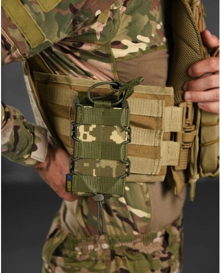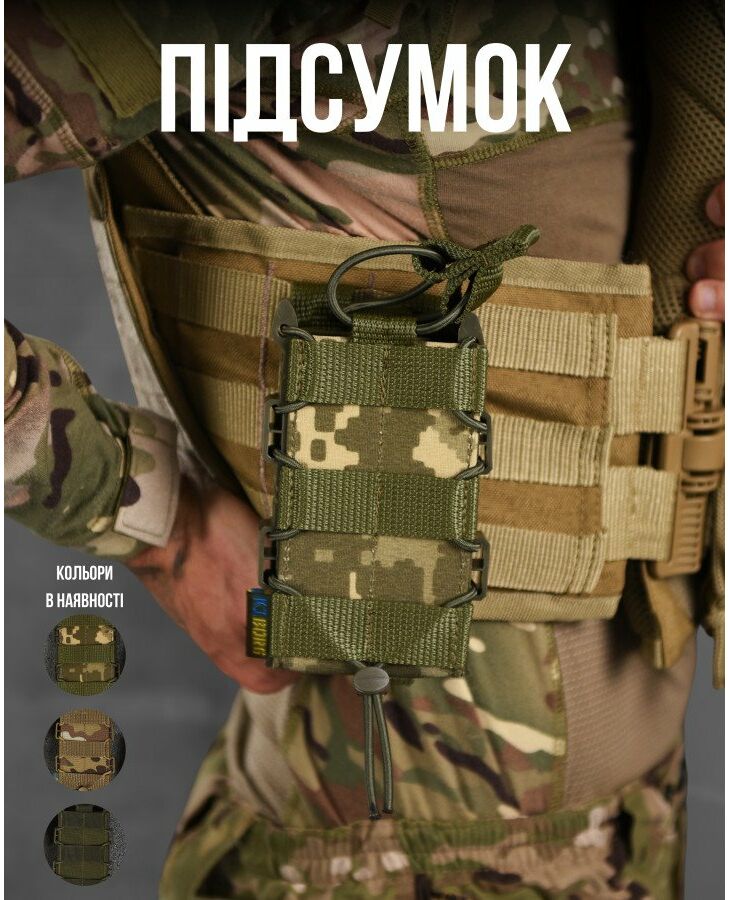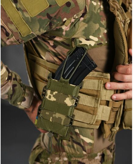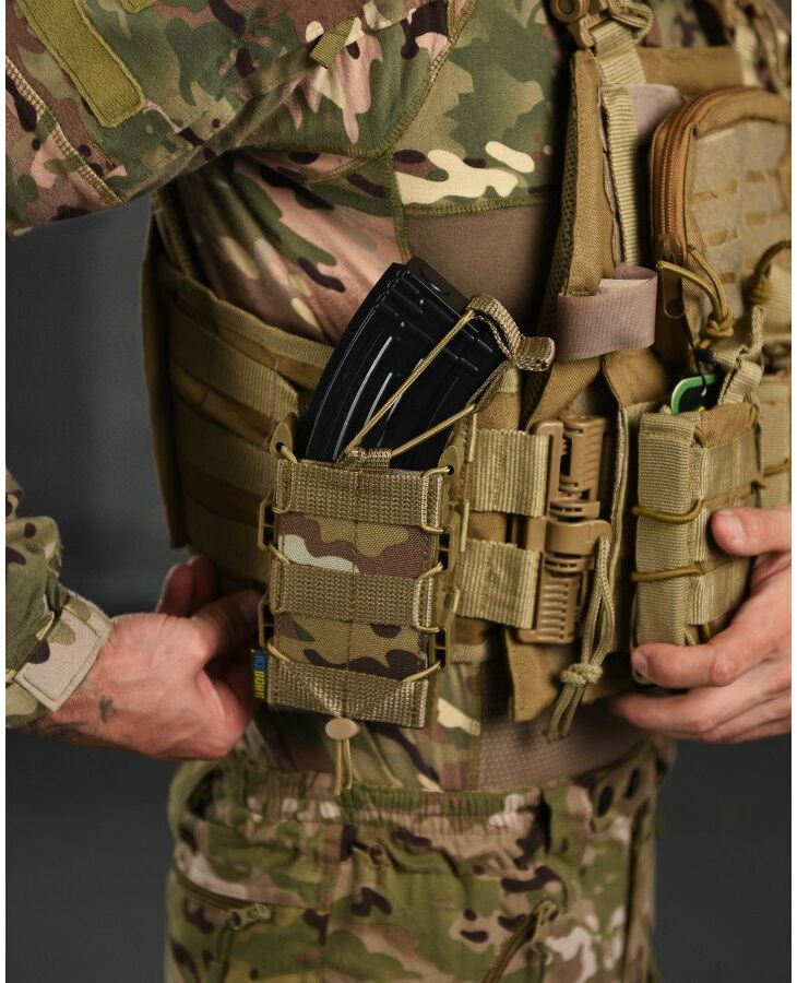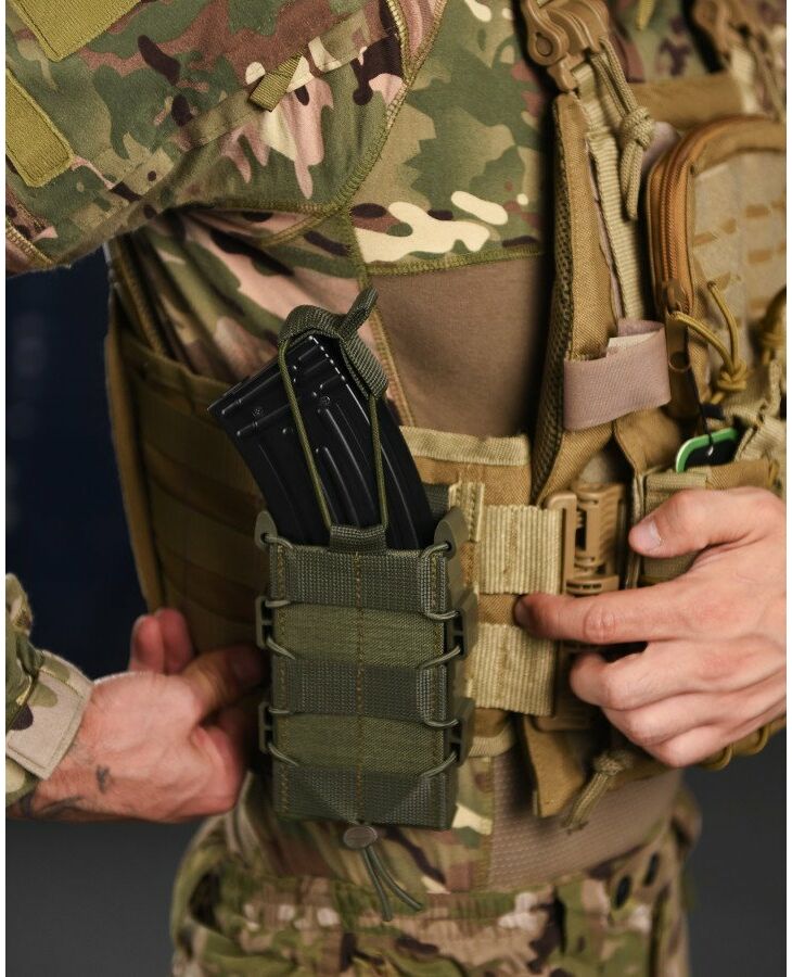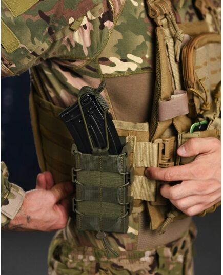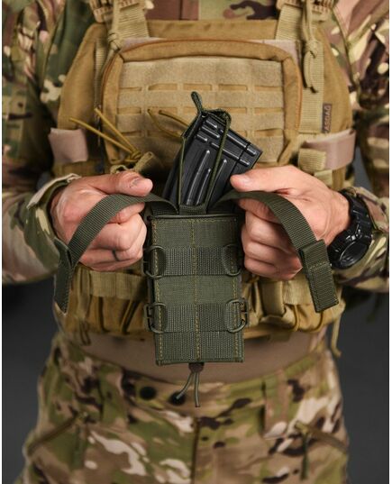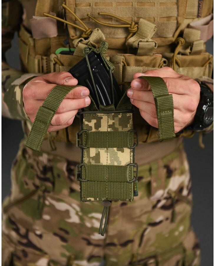 ● Задня частина підсумку має стропи для кріплення на систему Molle. Хластики жорсткі, дубльовані регіліном. У нашому підсумку магазин надійно фіксується і не доводиться навіть якщо перевернути і сильно потрясти. При цьому легко та швидко виймається рукою.