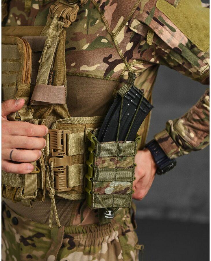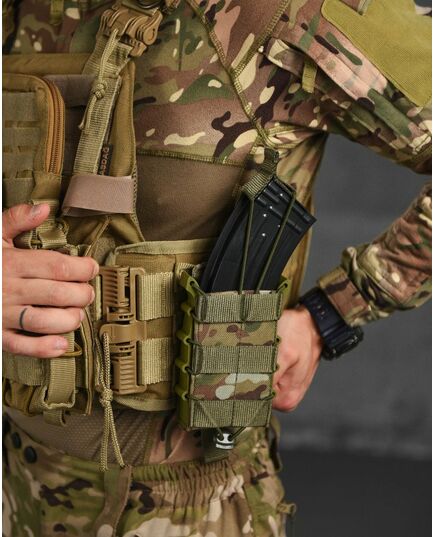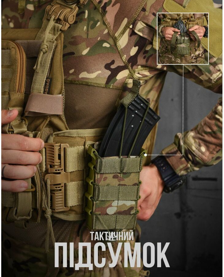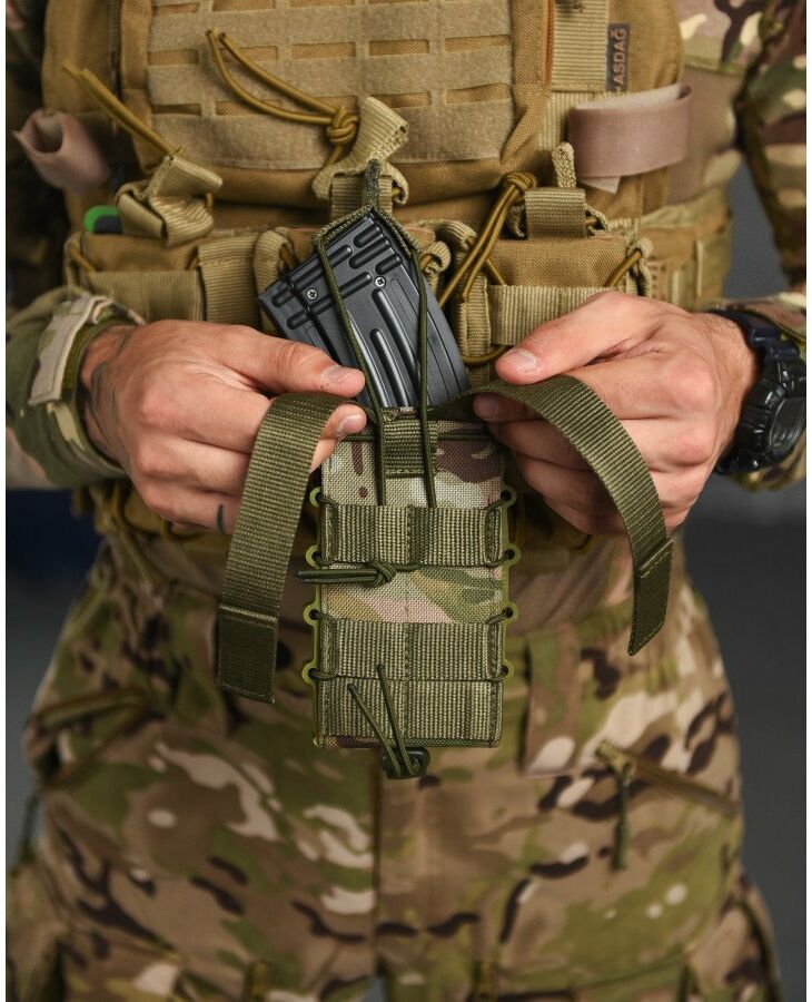 ● Задня частина підсумку має стропи для кріплення на систему Molle. Хластики жорсткі, дубльовані регіліном. У нашому підсумку магазин надійно фіксується і не доводиться навіть якщо перевернути і сильно потрясти. При цьому легко та швидко виймається рукою.