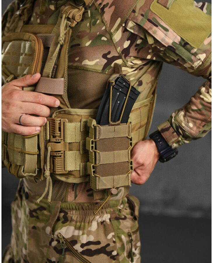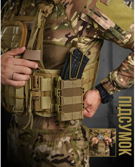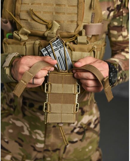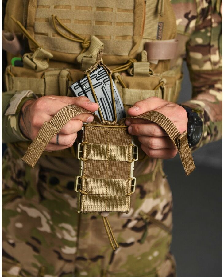 ● Задня частина підсумку має стропи для кріплення на систему Molle. Хластики жорсткі, дубльовані регіліном. У нашому підсумку магазин надійно фіксується і не доводиться навіть якщо перевернути і сильно потрясти. При цьому легко та швидко виймається рукою.