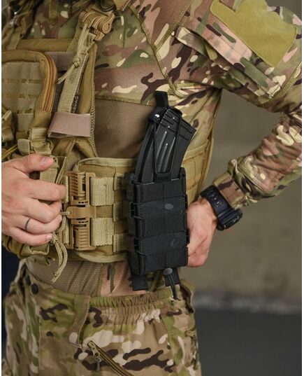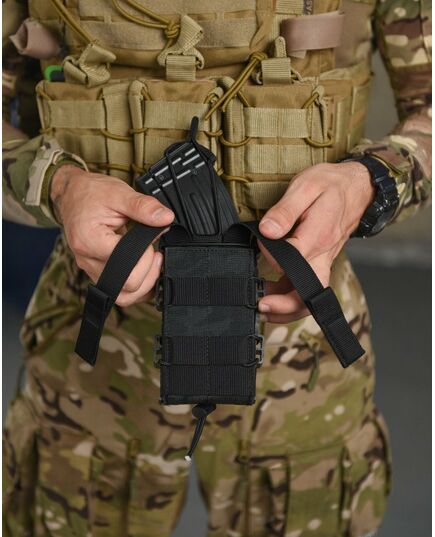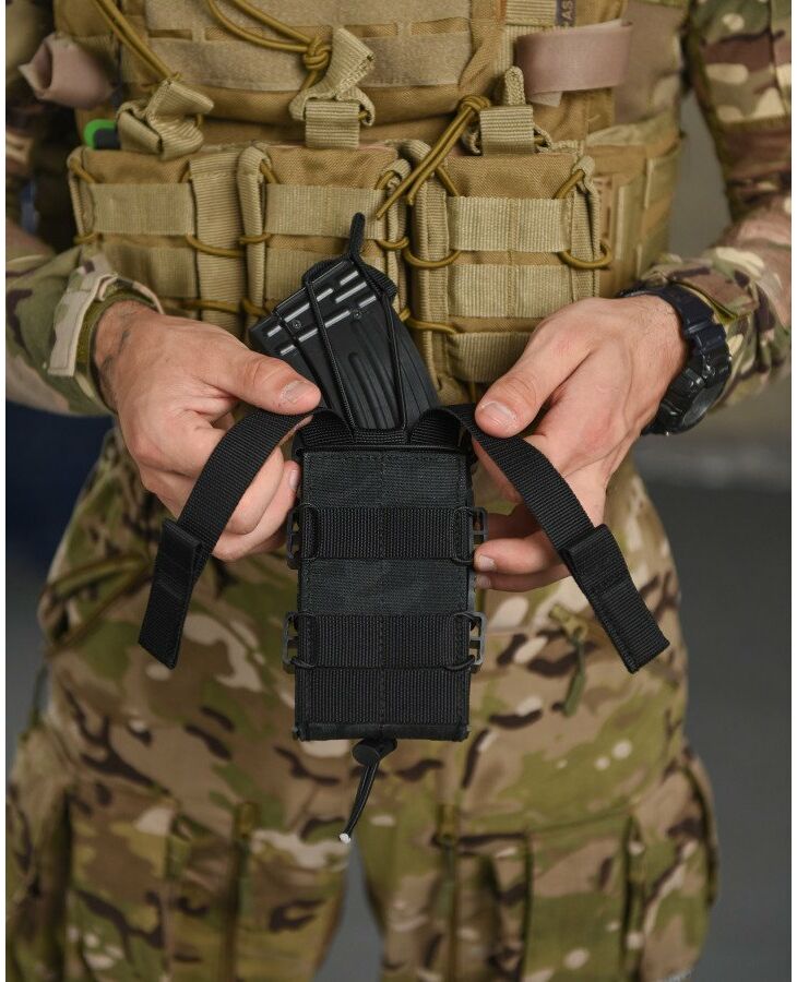 ● Задня частина підсумку має стропи для кріплення на систему Molle. Хластики жорсткі, дубльовані регіліном. У нашому підсумку магазин надійно фіксується і не доводиться навіть якщо перевернути і сильно потрясти. При цьому легко та швидко виймається рукою.