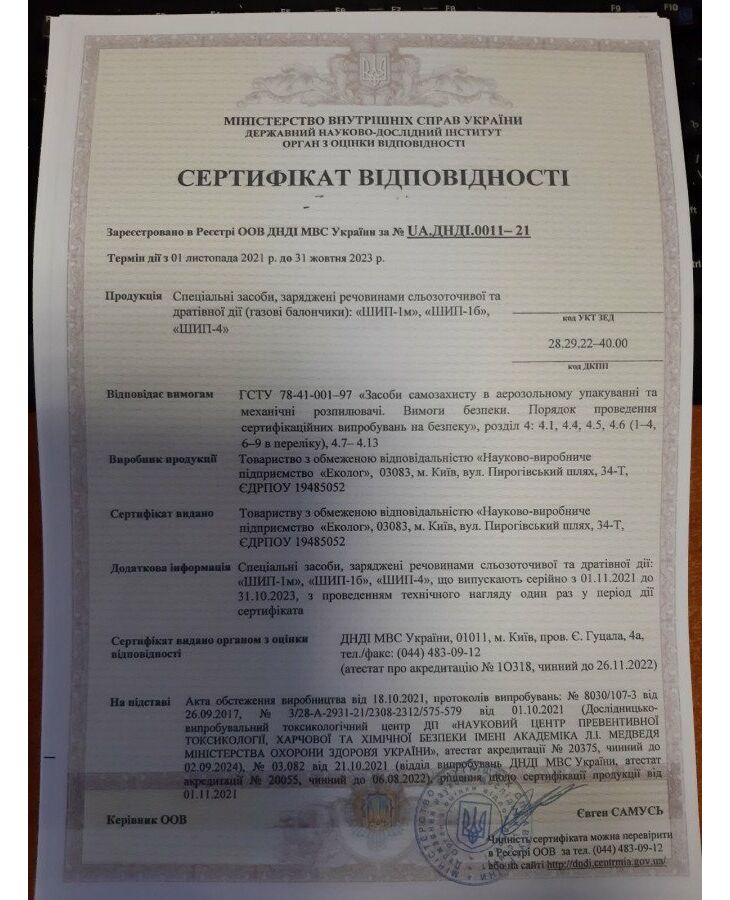 Діюча речовина – морфолід пеларгонової кислоти. Викликає сильну сльозотечу, подразнення очей та слизових оболонок носоглотки. Маса заправленого балону: 75 г. Ефективна дальність застосування: до 3 м. Габаритні розміри: висота 124 мм. Габаритні розміри: діаметр 35 мм. Година безперервного використання: 6...7 с. Зберігати та використовувати при температурі: від -8˚С до +45˚С