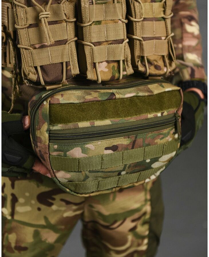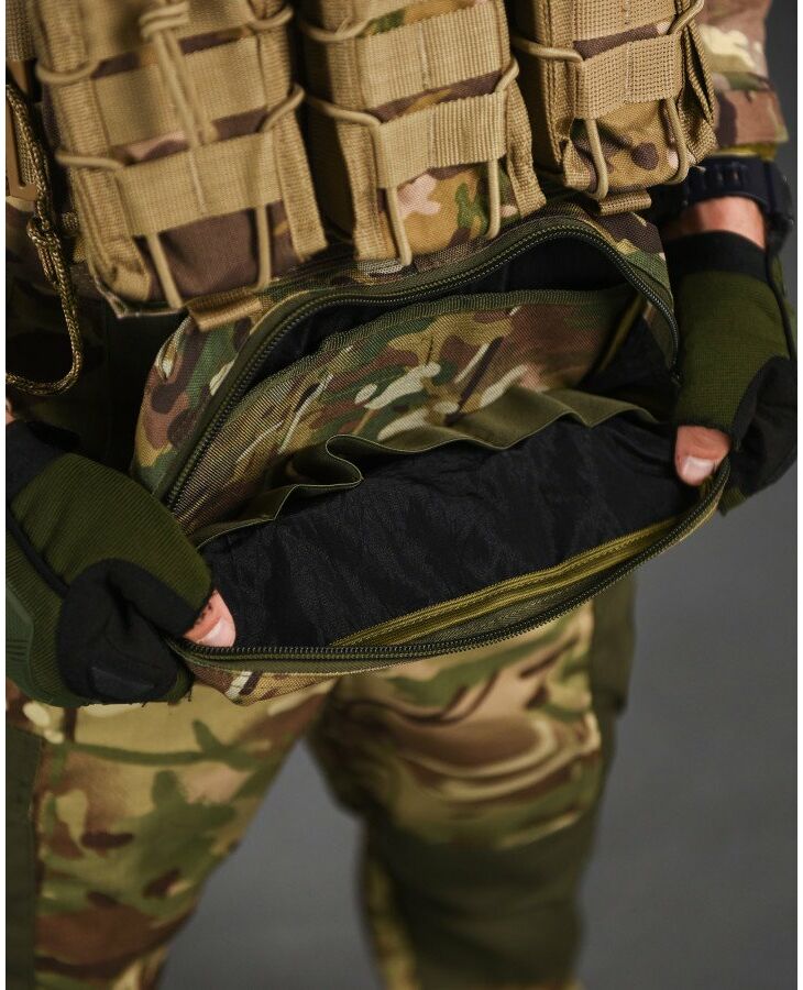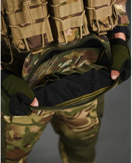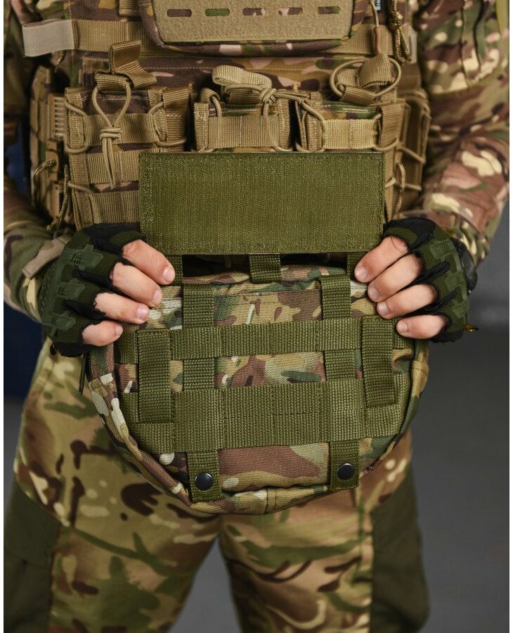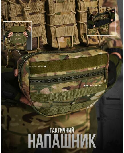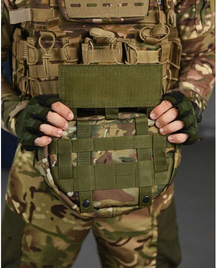 Практична та функціональна сумка-напашник чудово доповнить індивідуальний комплект спорядження будь-якого професійного військового та збільшить площу захисту. під захисним клапаном, збільшуючи таким чином їх функціональні можливості. Попереду результат обшитий стропами MOLLE, що дозволить вам закріпити на нього будь-які необхідні вам елементи спорядження. Основою напашника є велике відділення для особистих речей, Також, напашник обладнаний відсіком під балістичний захист, він перетворює ваш органайзер сумку-напашник, на додатковий захисний елемент від уламків, що при нагоді може врятувати життя.