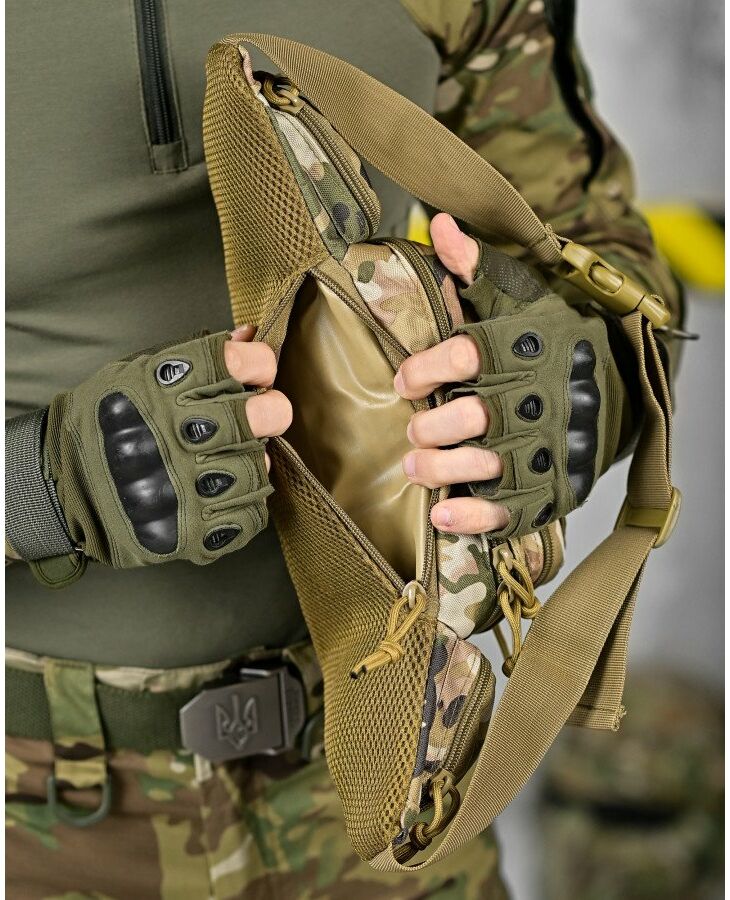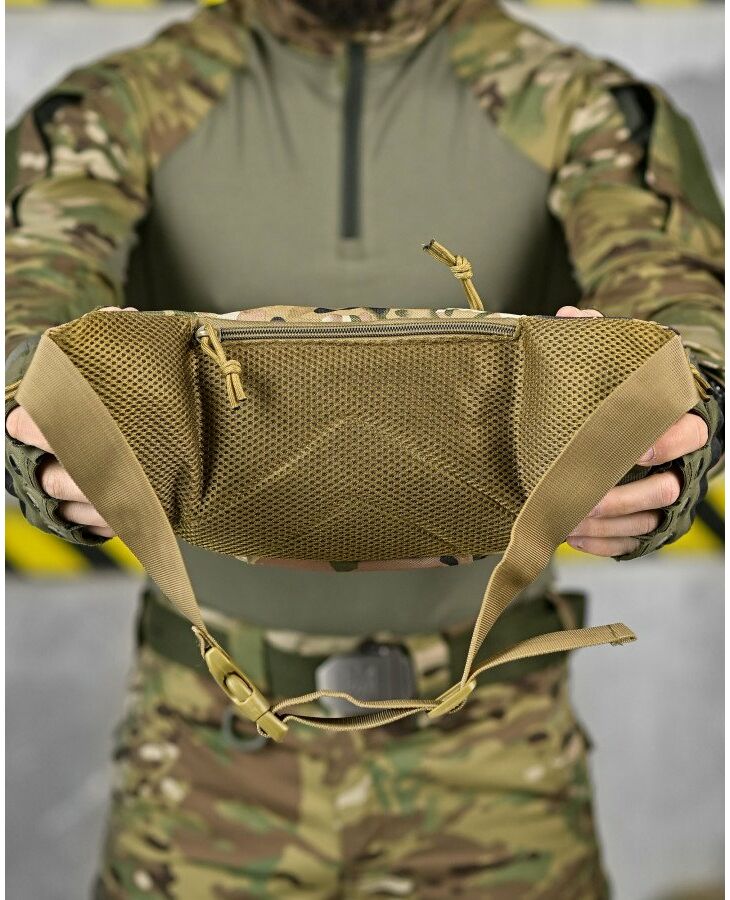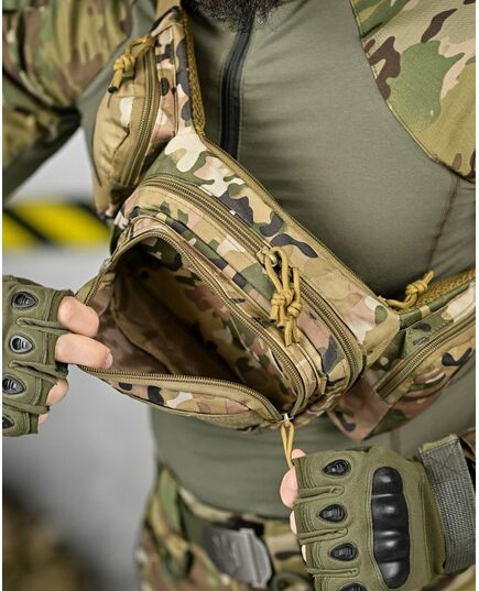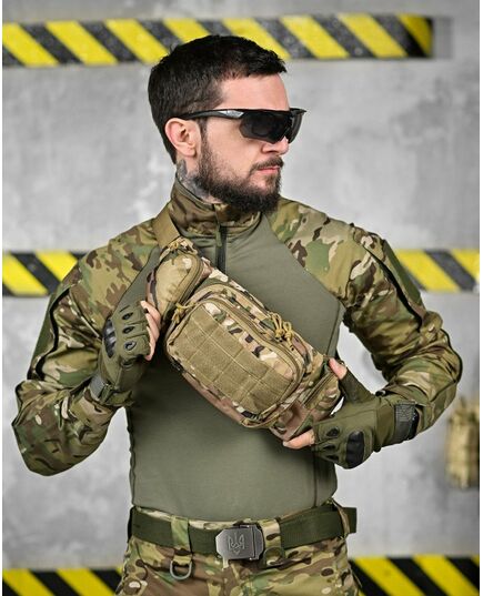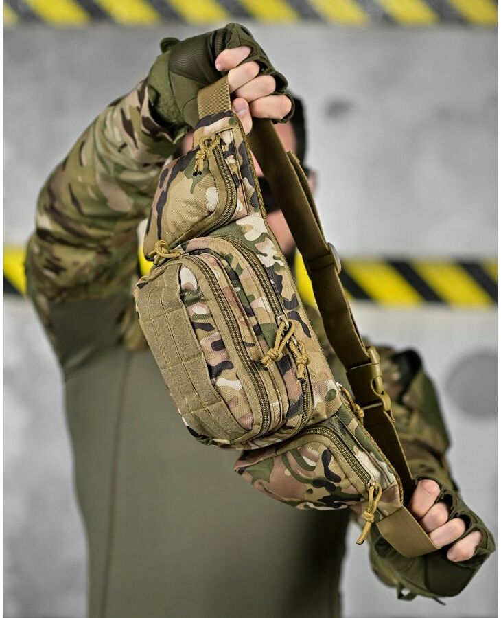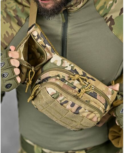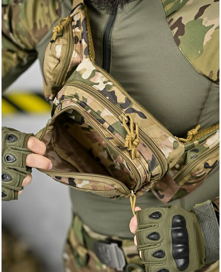 Модель має 4 відділення, три спереду і одне ззаду, в які можна покласти телефон, гаманець, ключі, павербанк і багато іншого завдяки їх ємності. Спереду знаходиться панель з велкро, яка використовується для кріплення патчів (шевронів), і невеликого спорядження в панелі є відсіки для кріплення маленьких предметів. Виготовлена з тканини Oxford 600D і високоякісної фурнітури. Довжина ременя регулюється з обох сторін, тому зручно носити як на праву, так і на ліву сторону.