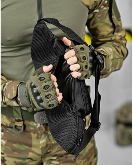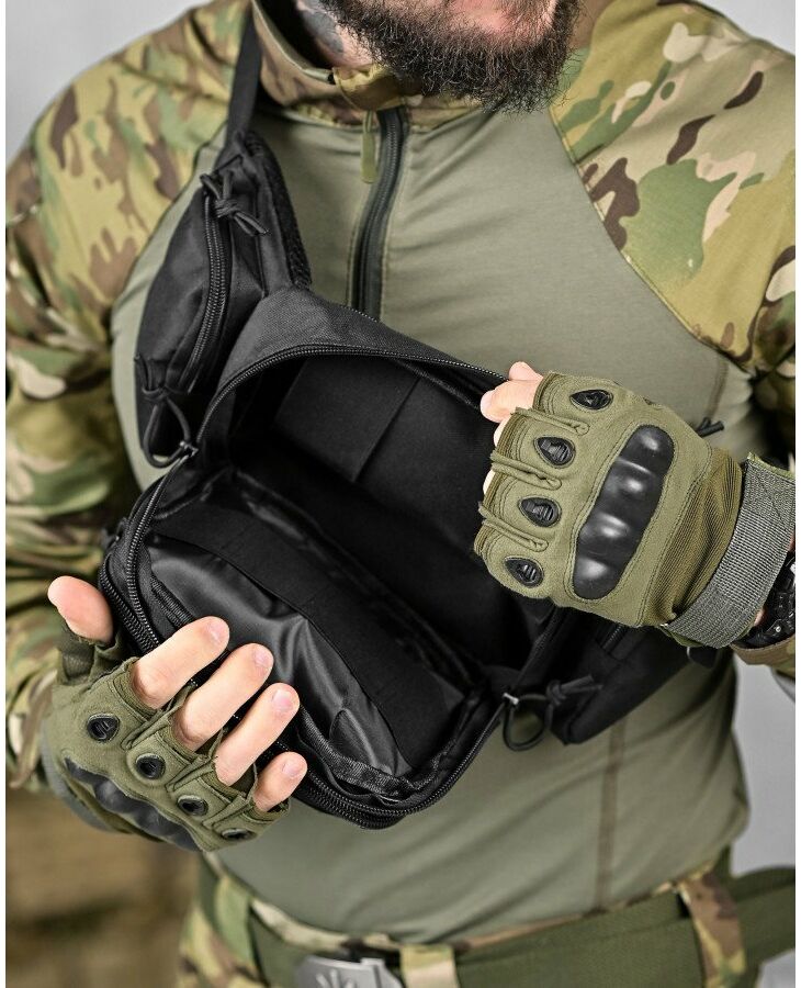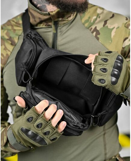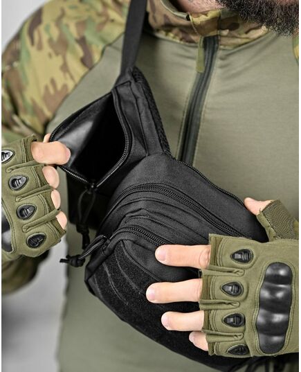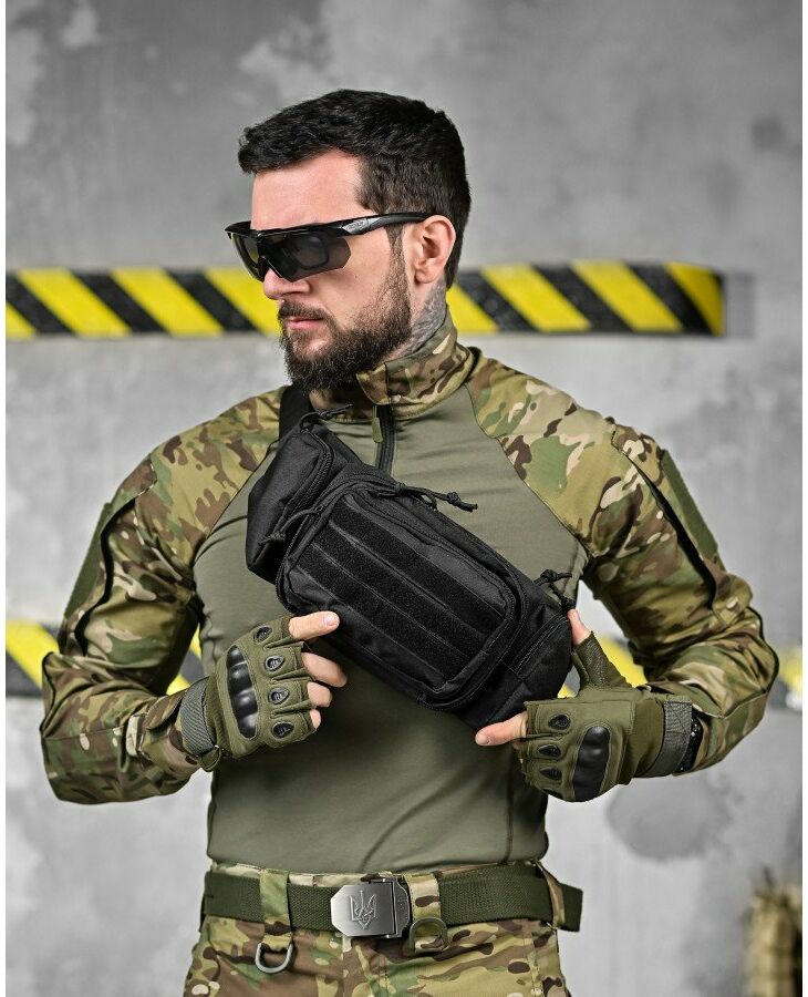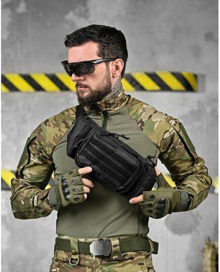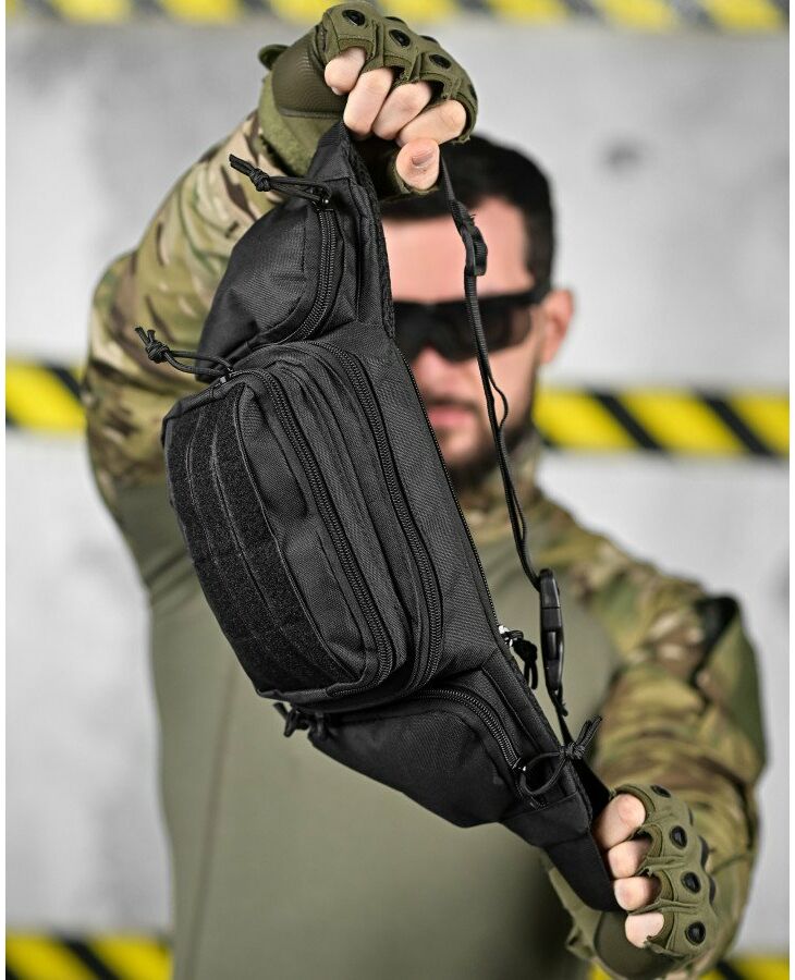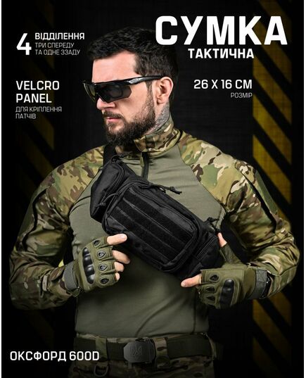 Модель має 4 відділення, три спереду та одне ззаду, в які можна покласти телефон, гаманець, ключі, павербанк та багато іншого завдяки їх ємності. Попереду знаходиться панель з велкро, яка використовується для кріплення патчів (шевронів), і невеликого спорядження, в панелі є відсіки для кріплення невеликих предметів. Виготовлена з тканини Oxford 600D і високоякісної фурнітури. Довжина ремінця регулюється з обох сторін, тому зручно носити як на правій, так і на лівій стороні.