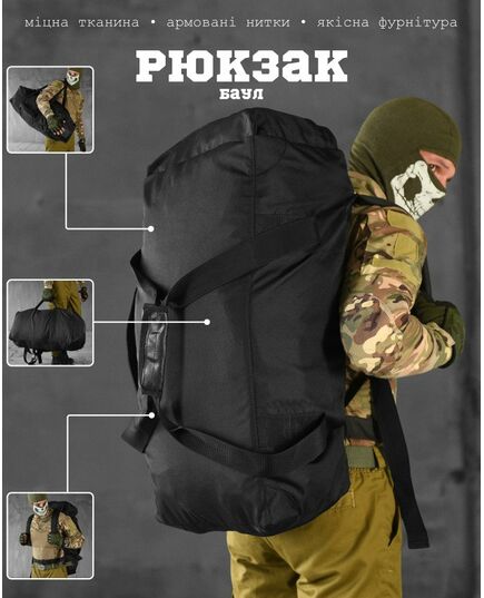 Сумка баул транспортна тактична армійська поєднує в собі зручність та надійність сумки, баула та рюкзака. Сумка баул тактична виконана з тканини Кордура 1000. Ця сумка буде зручна як військовим так і для цивільних потреб. Має зовнішні ручки, плечові лямки. Основне відділення закривається на центральну застібку «блискавку» з двома бігунками.