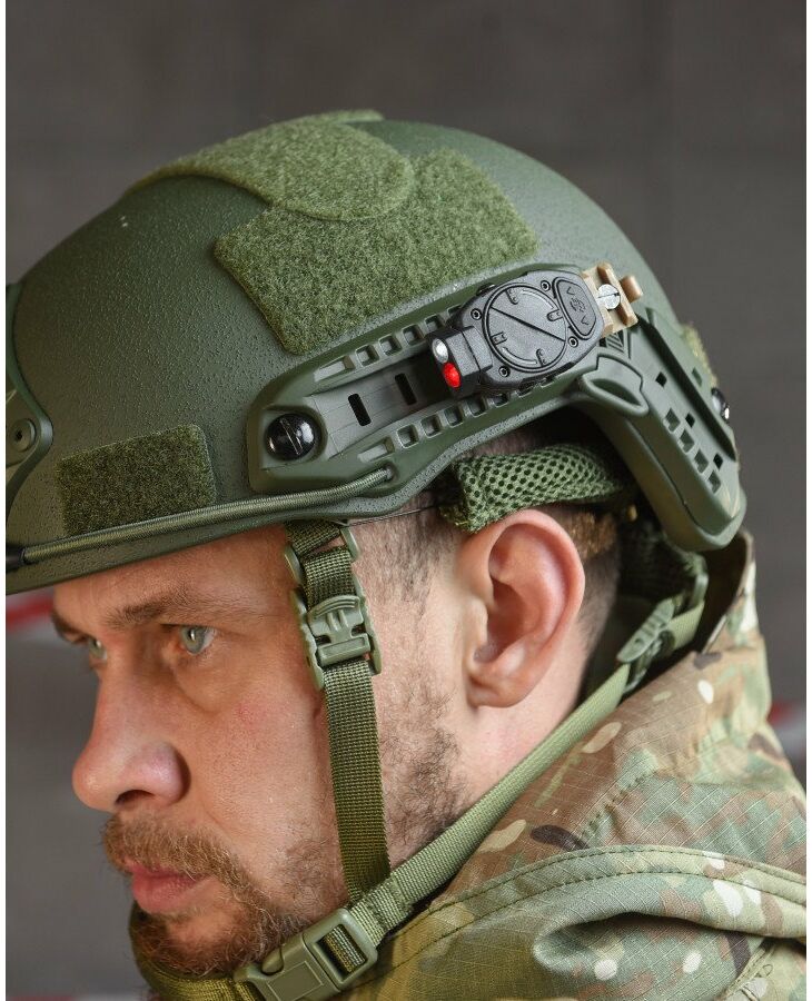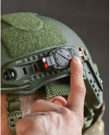 Тактичний ліхтарик на шолом оснащений режимами червоного та білого світла. Він сумісний з більшістю шоломів, таких як MICHT, FAST та їх аналоги, кріпиться збоку на рейку. Цей ліхтар також можна встановити на зброю завдяки кріпленню для планки Пікатіні, що входить до комплекту. Пристрій оснащений трьома білими та двома червоними світлодіодами з регульованою яскравістю. На бічній частині розташований інфрачервоний маячок IFF, що забезпечує ідентифікацію союзних сил через дрони, прилади нічного бачення та інші спеціальні оптичні пристрої. Живлення здійснюється від батарейки CR123A, яка йде в комплекті. 70х60 мм