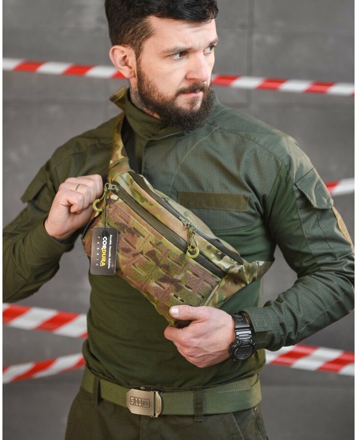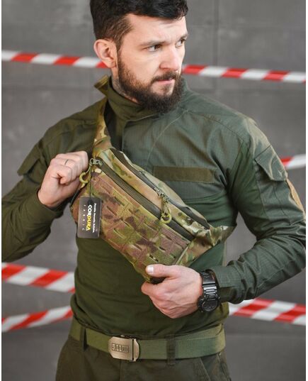 Модель має 4 відділення, три спереду та одне ззаду, в які можна положити телефон, гаманець, ключі, павербанк і багато іншого завдяки їх ємності. Попереду знаходиться панель з велкро, яка використовується для кріплення патчів (шевронів), і невеликого спорядження в панелі є відсіки для кріплення невеликих предметів. Виготовлена з тканини Oxford 600D і високоякісної фурнітури. Довжина ременя регулюється з обох сторін, тому зручно носити як на праву, так і на ліву сторону.