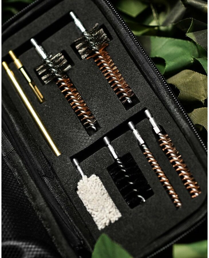 У наборі присутні латунні ерші як для .223, так і для .30 (7.62). Також ерші для чищення патронника .223, 7.62. Пуховка та нейлоновий ерш більшого розміру для прочищення зони патронника. Серветка універсальна, можна чистити одразу і 223, і 7,62, все залежить від розміру патчів.
