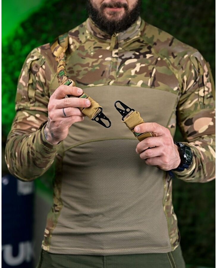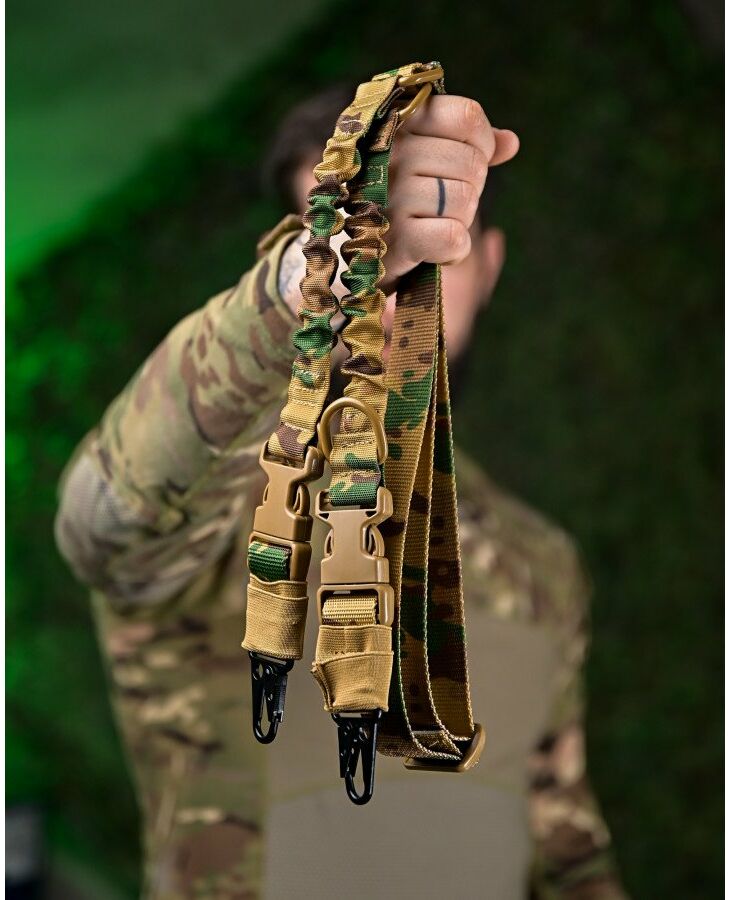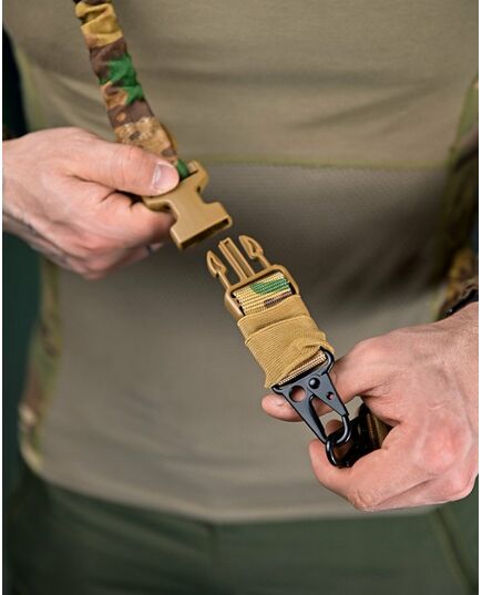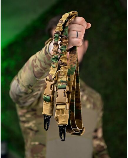 Нейлоновий двохточковий ремінь з металевими карабінами. Перед кожним карабіном присутня еластична вставка для зменшення навантаження на плече і гашення тряски під час ходьби та швидкого переміщення. Регулюється по довжині і підлаштовується під конкретну зброю.