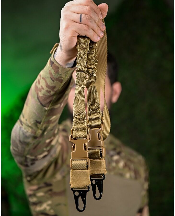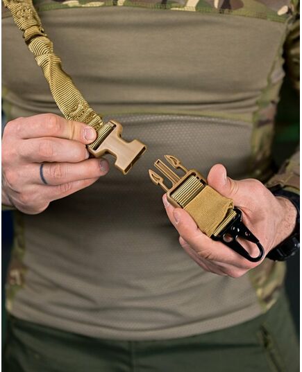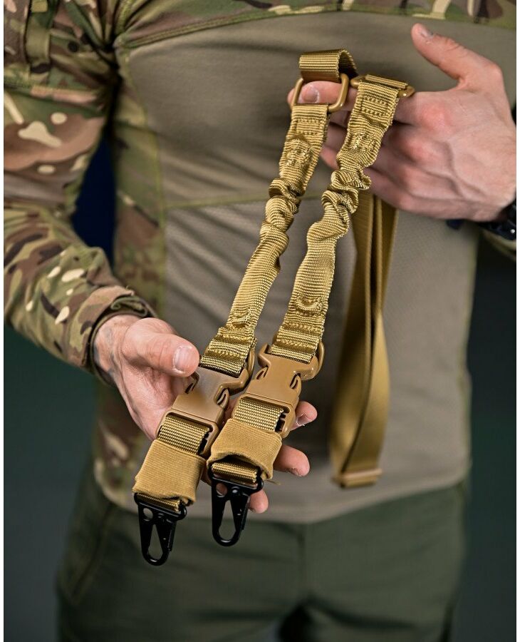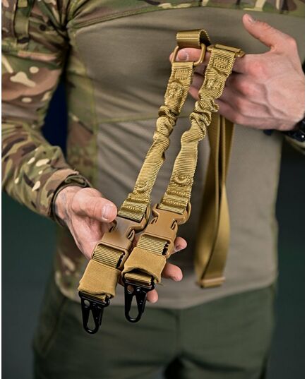 Нейлоновий двухточковий ремінь з металевими карабінами. Перед кожним карабінами присутня еластична вставка для зменшення навантаження на плече і гасіння тряски під час ходьби та швидкого переміщення. Регулюється по довжині та підлаштовується під конкретну зброю.