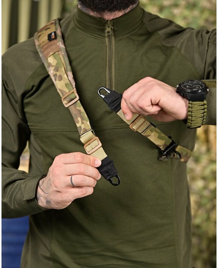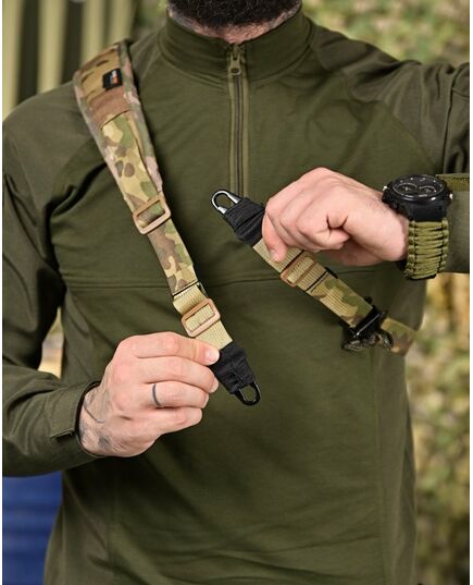 Кулевий  ремінь з м'якою підкладкою плеча може бути використаний як одноточковий або двоточковий завдяки конструкції карабінів.
