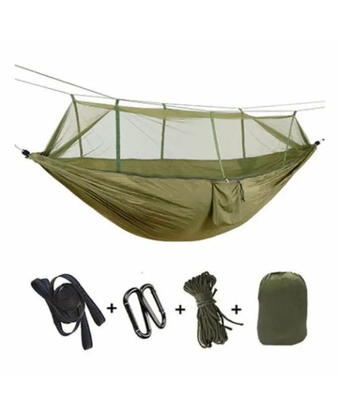 Колір: хакі; Розміри: 250 х 120 см; Матеріал: парашут + сітка; Чохол: Так, вшитий у гамак, 2 в 1: може слугувати сумкою для зручного перенесення, а в розгорнутому вигляді може бути кишенею, наприклад, для телефона); Максимальне навантаження: 200 кг; Москітна сітка: Так, знімна; Вага: 700 г.