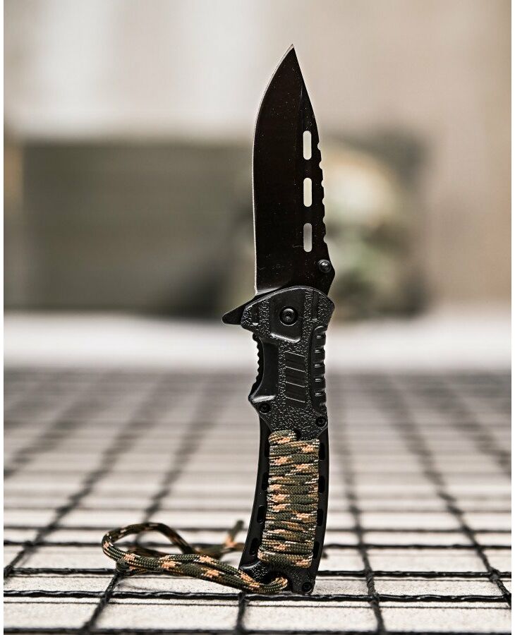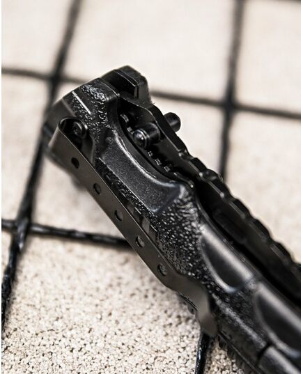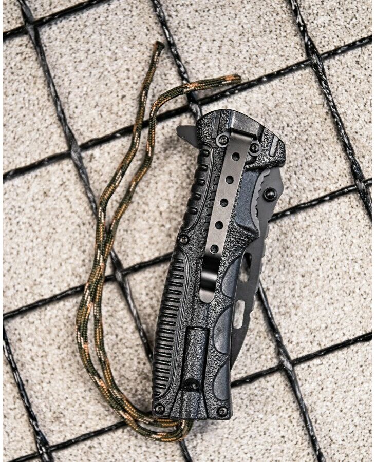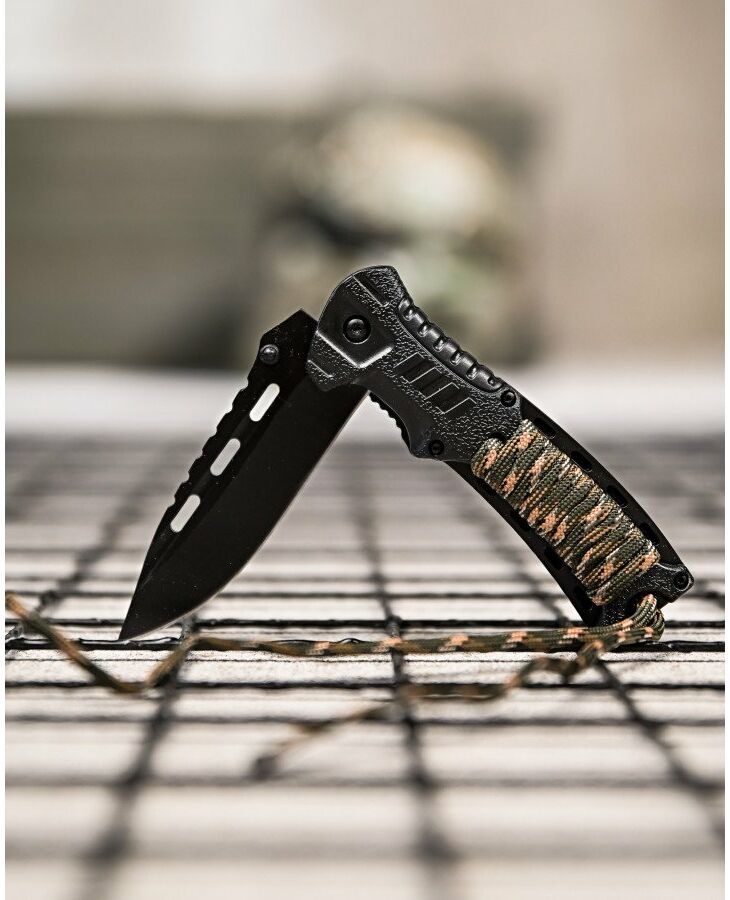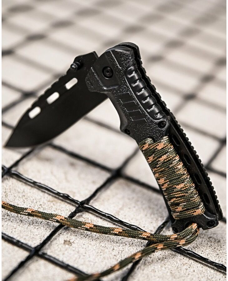 У рукоятці є дизайнерські вирізи та отвори, через які проходить паракорд. Довгі закінчення цієї оплетки можна використовувати як темляк.