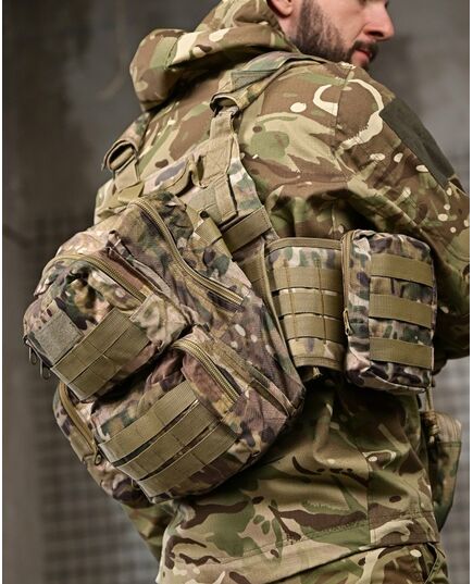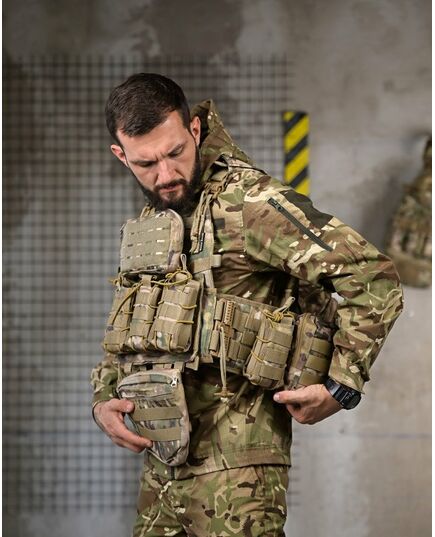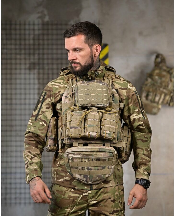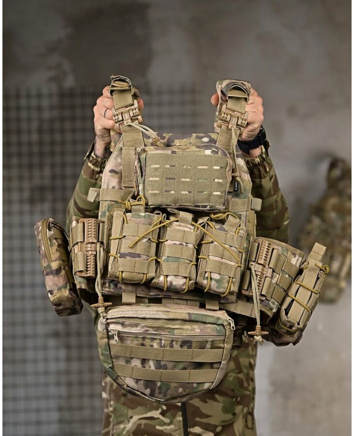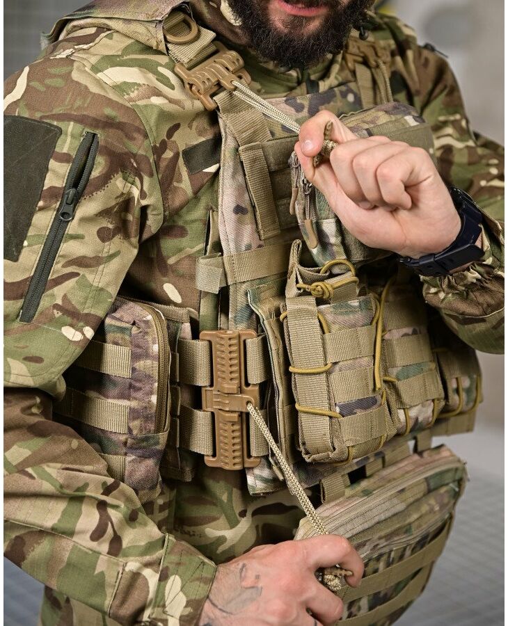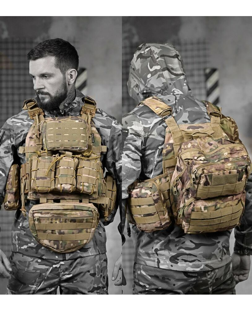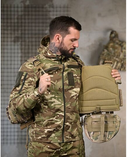 * На зворотному боці знімний штурмовий рюкзак, який кріпиться на молле і дозволяє переносити як додатковий БК, так і гідратор.