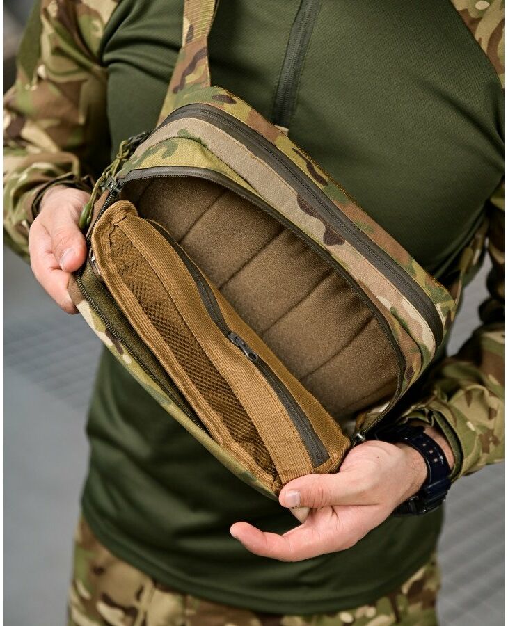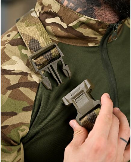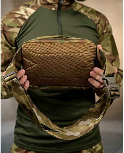 - Оснащена регульованим широким ременем для носіння, що застібається на пряжки.