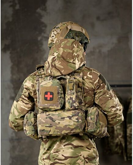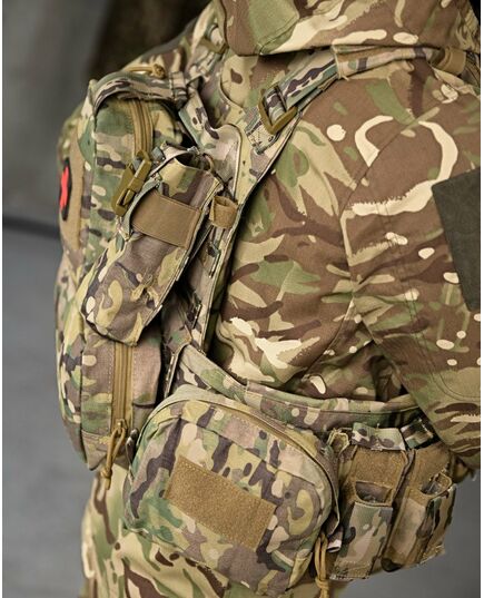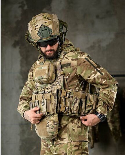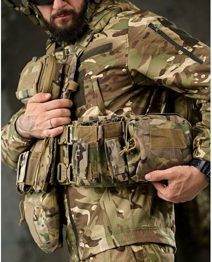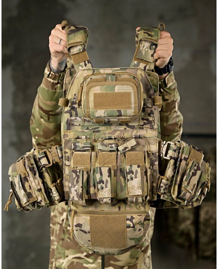 Матеріал: Cordura 1000D - Інтерфейс: Розширена передня панель з адміністративним підсумком. Передня панель з можливістю розмістити 7 магазинів АК, AR Сумка-напашник з резинкою під турнікет Лазерна різка Система MOLLE по всій поверхні жилета, Підсумки під автоматні магазини з системою MOLLE, Еластичний пояс жилета з підсумками на 4 магазини АК, AR, рацію або турнікет, з кожного боку - Подвійна стінка жилета, під бронеплиту та під додаткову балістичну захисту - Чохол для бронежилета, призначений для перенесення бронеплит стандартних розмірів 25*30см, спереду і ззаду. - Передня та задня сторони жилета оснащені системою MOLLE, яка розширює обладнання - Передня та задня сторони жилета Снімні і мають велкро панелі, можна модернізувати жилет, передню робочу панель можна змінювати на більш розширену, з більшим функціоналом, також вона додатково кріпиться за допомогою швидкоз’ємних фастексів. - На передніх і задніх частинах чохла розміщені велкро панелі для патчів з системою MOLLE - По всій площі жилет обшитий стропами системи MOLLE, що дає можливість переносити, у зручному положенні підсумки і спорядження. - Регулюється за обхватом і висотою. - Снімний пояс - Швидкоз’ємний пояс і плечові ремені жилета - Також плечові ремені обладнані додатковими чохлами для комфортної носки жилета з системою MOLLE - Грудна частина жилета і спина обладнані демпферною дихаючою сітчастою тканиною