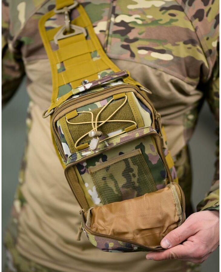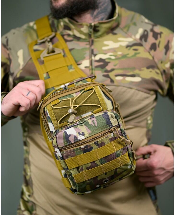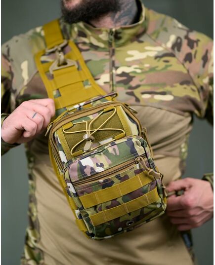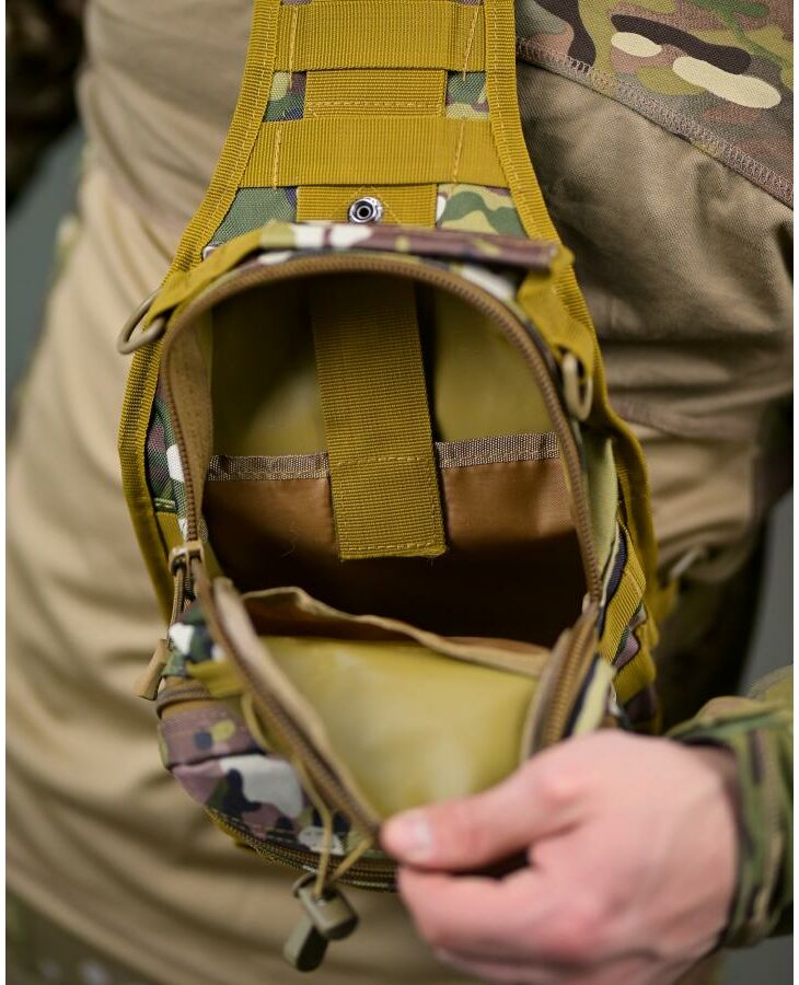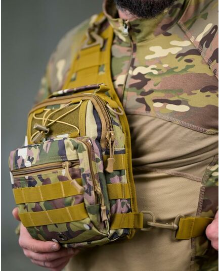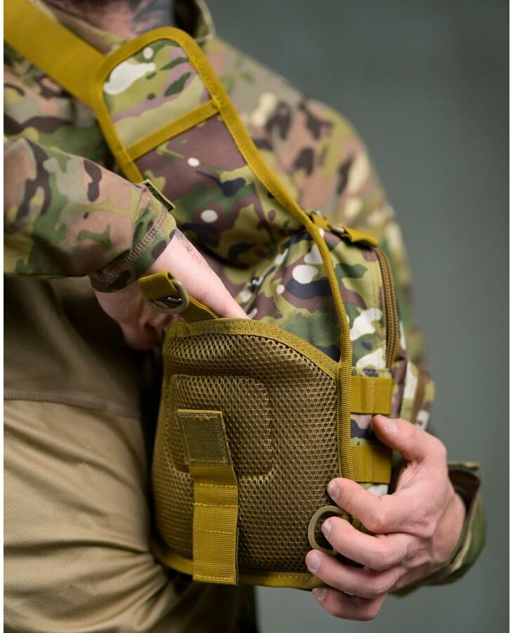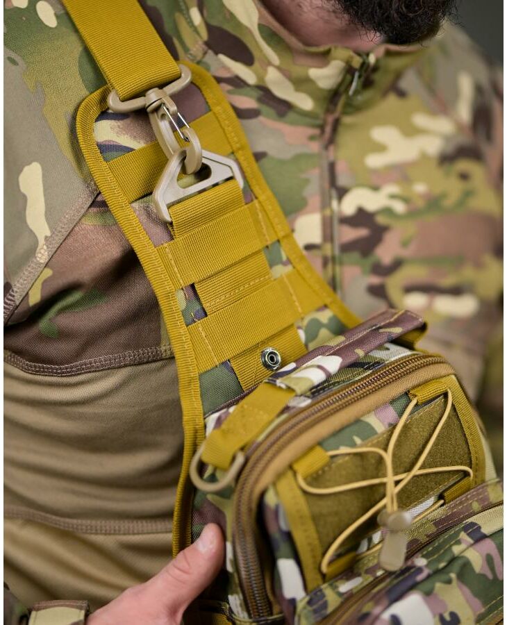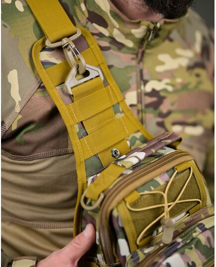 Регульований плечовий ремінь дозволяє носити сумку з будь-якого боку, а система MOLLE дає можливість кріплення додаткового спорядження.