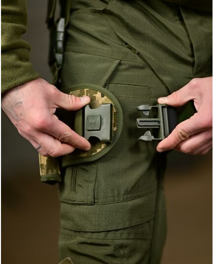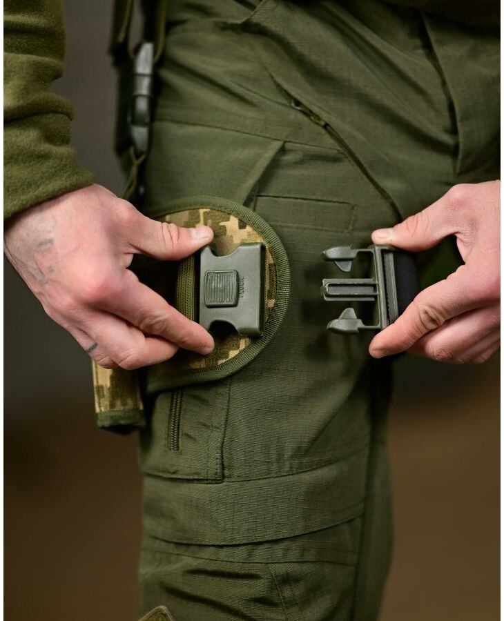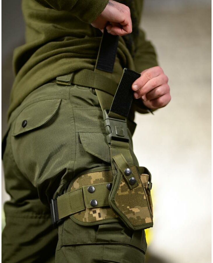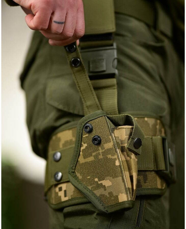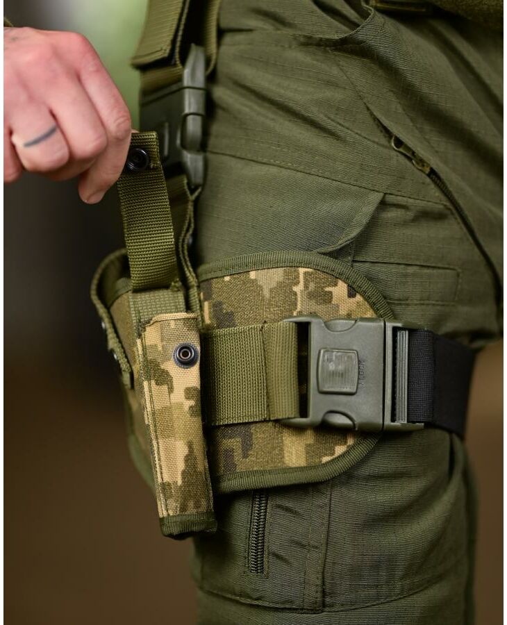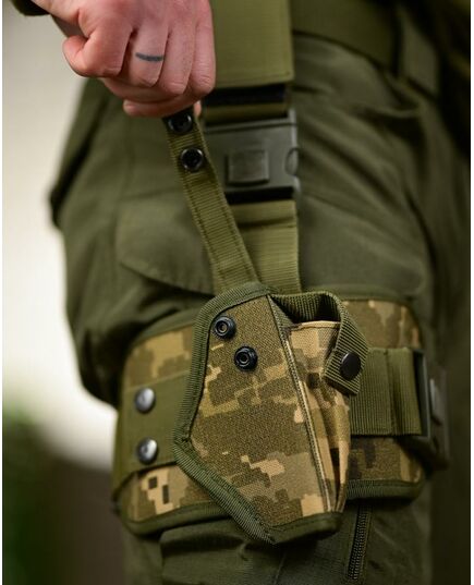 Виготовлена з міцного матеріалу кордури, стійкого до зношування та механічних навантажень. Оснащена подвійною системою фіксації: поясним кріпленням і регульованим стегновим ременем, що забезпечує надійну посадку і зручність під час руху. Підходить для більшості пістолетів стандартного розміру.