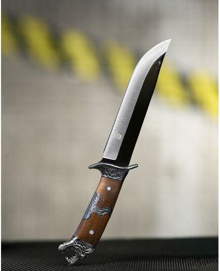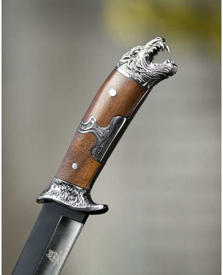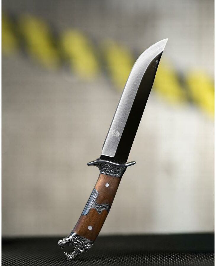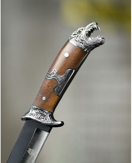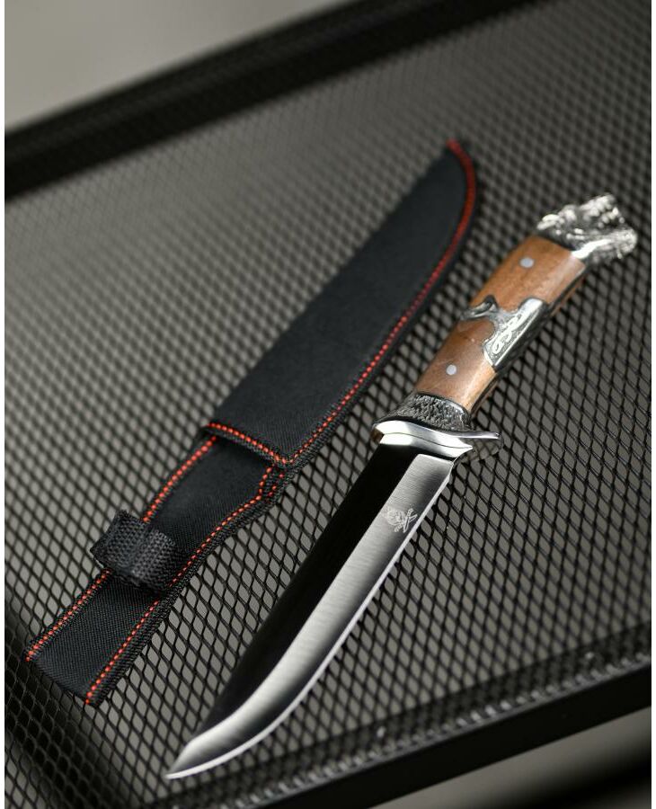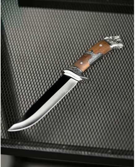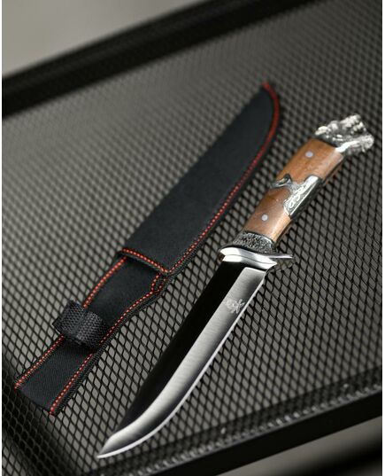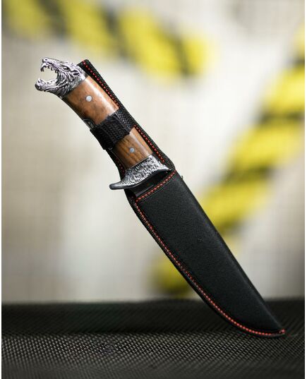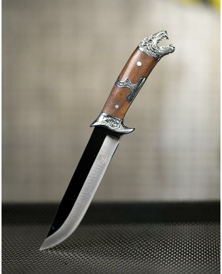 - Тильник ножа: прикрашений вишуканим литим зображенням голови вовка, що символізує силу, свободу та мисливський дух.
