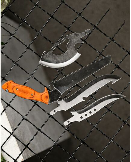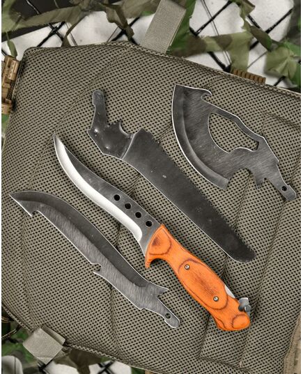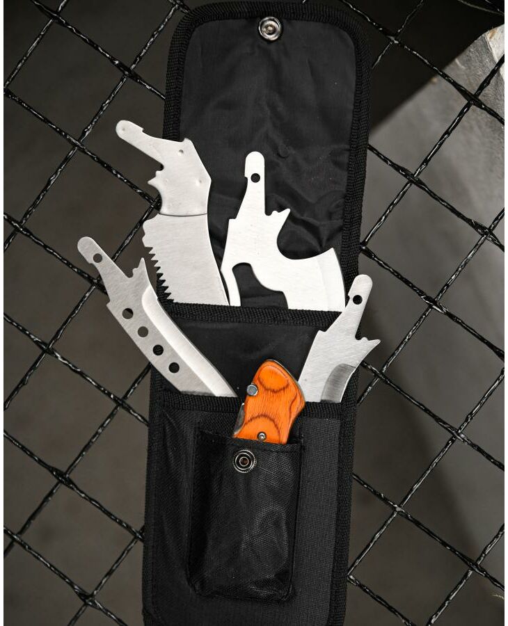 Туристичний набір 4 в 1 дозволяє спростити процес підготовки до походів. Його універсальність полягає в тому, що, змінюючи підходящі леза до тієї чи іншої ситуації, не потрібно нічого шукати, а достатньо лише підібрати необхідний варіант з комплекту і зафіксувати його з рукояткою (основою). При цьому всі предмети складаються в чохол, який зручно кріпиться на поясі, тим самим звільняючи місце в рюкзаку.