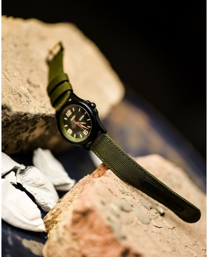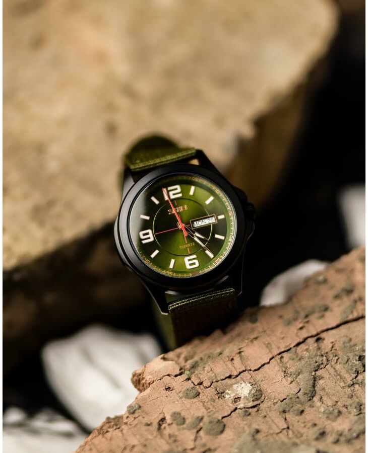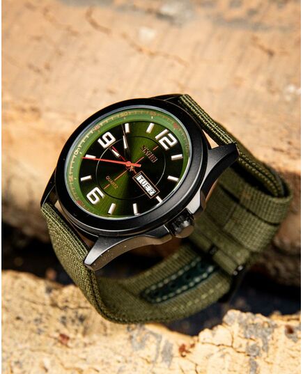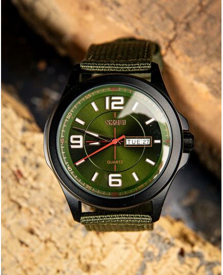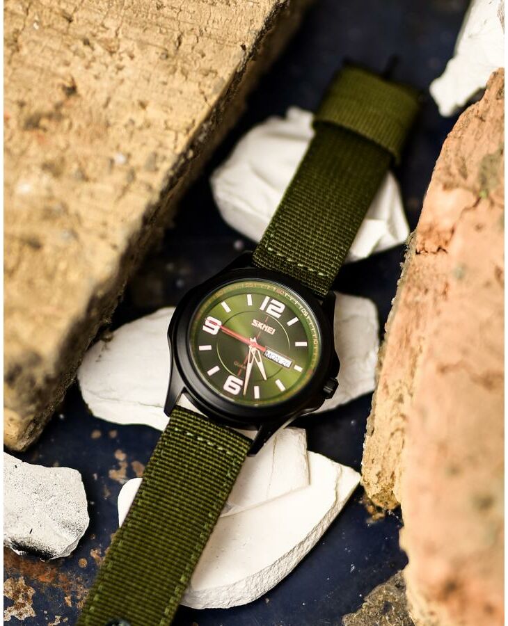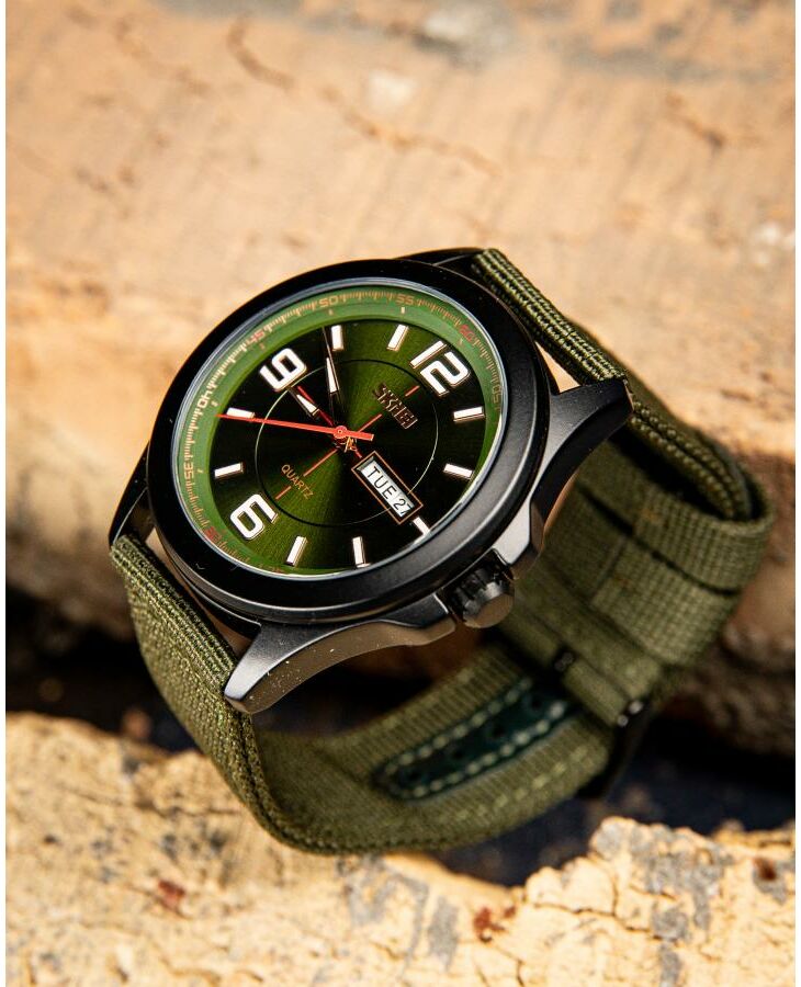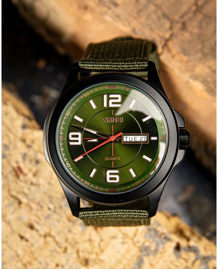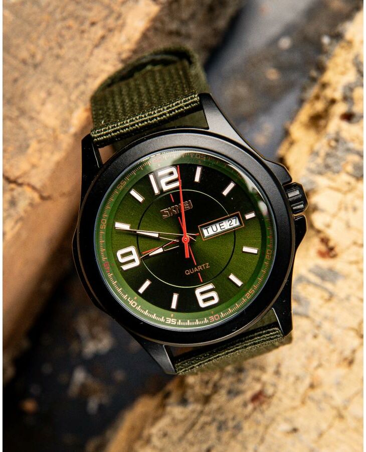 Годинник Skmei  Army Green – стильний і функціональний аксесуар для сучасного чоловіка. Він має водонепроникність до 30 м, що дозволяє використовувати його в умовах підвищеної вологості. Корпус виготовлений з металу, а ремінець – з текстилю, що забезпечує комфорт під час носіння. Годинник має класичний круглий циферблат з індикацією годин, хвилин, секунд, дня тижня та числа. Він виконаний у темно-зелених та чорних відтінках, що надає йому військового стилю. Габарити годинника становлять 50,2 х 45,8 мм, а їх вага – 61 г. Гарантія на пристрій становить 12 місяців. Skmei  – ідеальний вибір для любителів активного способу життя.